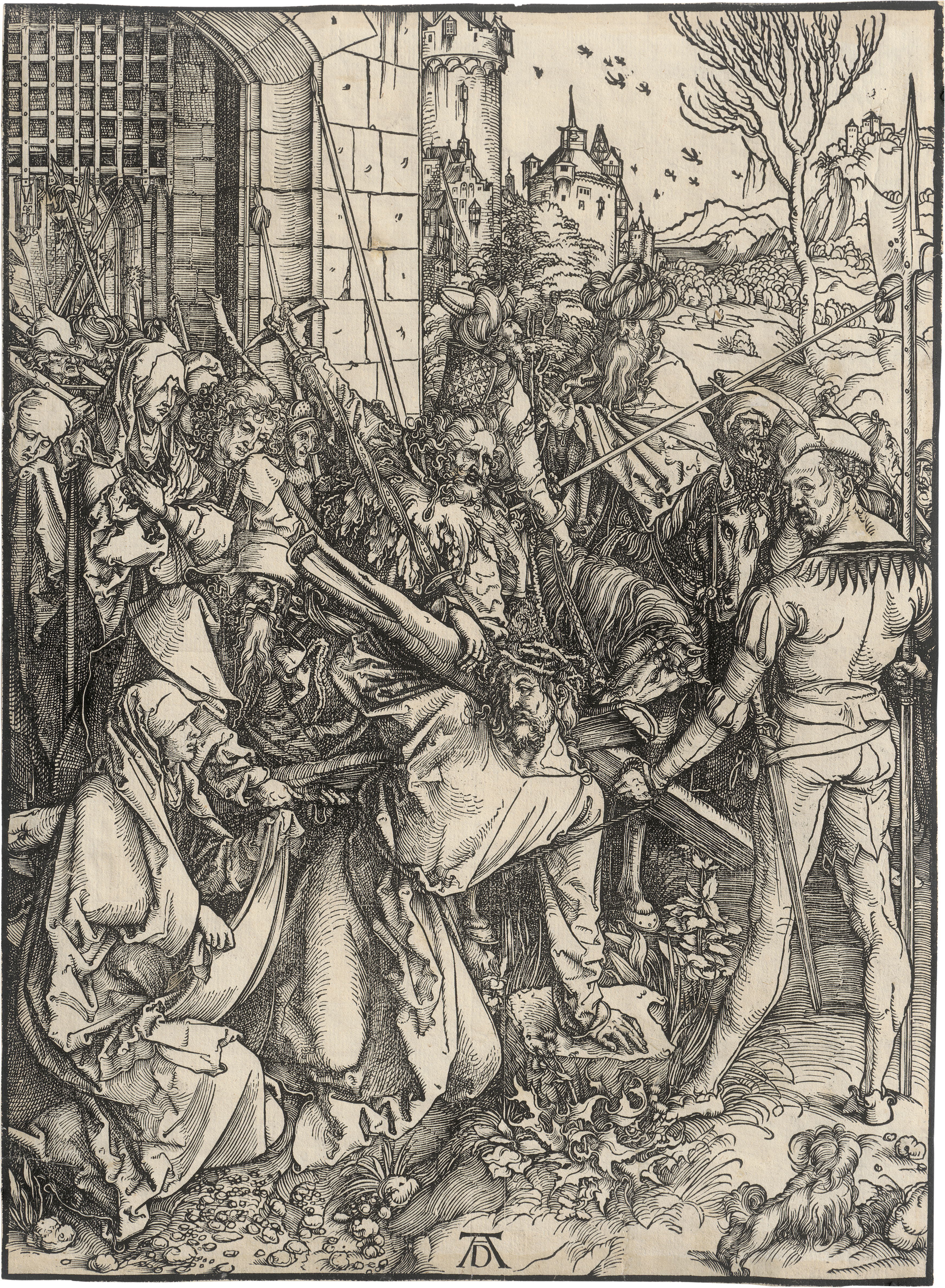 Blatt 7 der Folge. Prachtvoller, kräftiger und nur gelegentlich minimal ungleicher Frühdruck bis an die noch ganzrandige Einfassung beschnitten, partiell mit Spuren eines weißen Rändchens. Das Papier minimal gebräunt und fleckig, geglättete horizontale Mittelfalte, sehr sorgsam hinterfaserte Läsuren, etwa ein L-förmiger Riss unten durch die Distel und die abgestützte Hand Christi, ein Haarriss oben links im Falltor sowie ein kürzerer Randeinriss rechts unten, weitere kleinere Ausbesserungen, beispielsweise im Nacken des vorne rechts Stehenden oder in der Mauer neben der Lanze, einige dünnen Stellen ebenso hinterfasert, Leimspuren verso, im Gesamteindruck gleichwohl schönes Exemplar.
