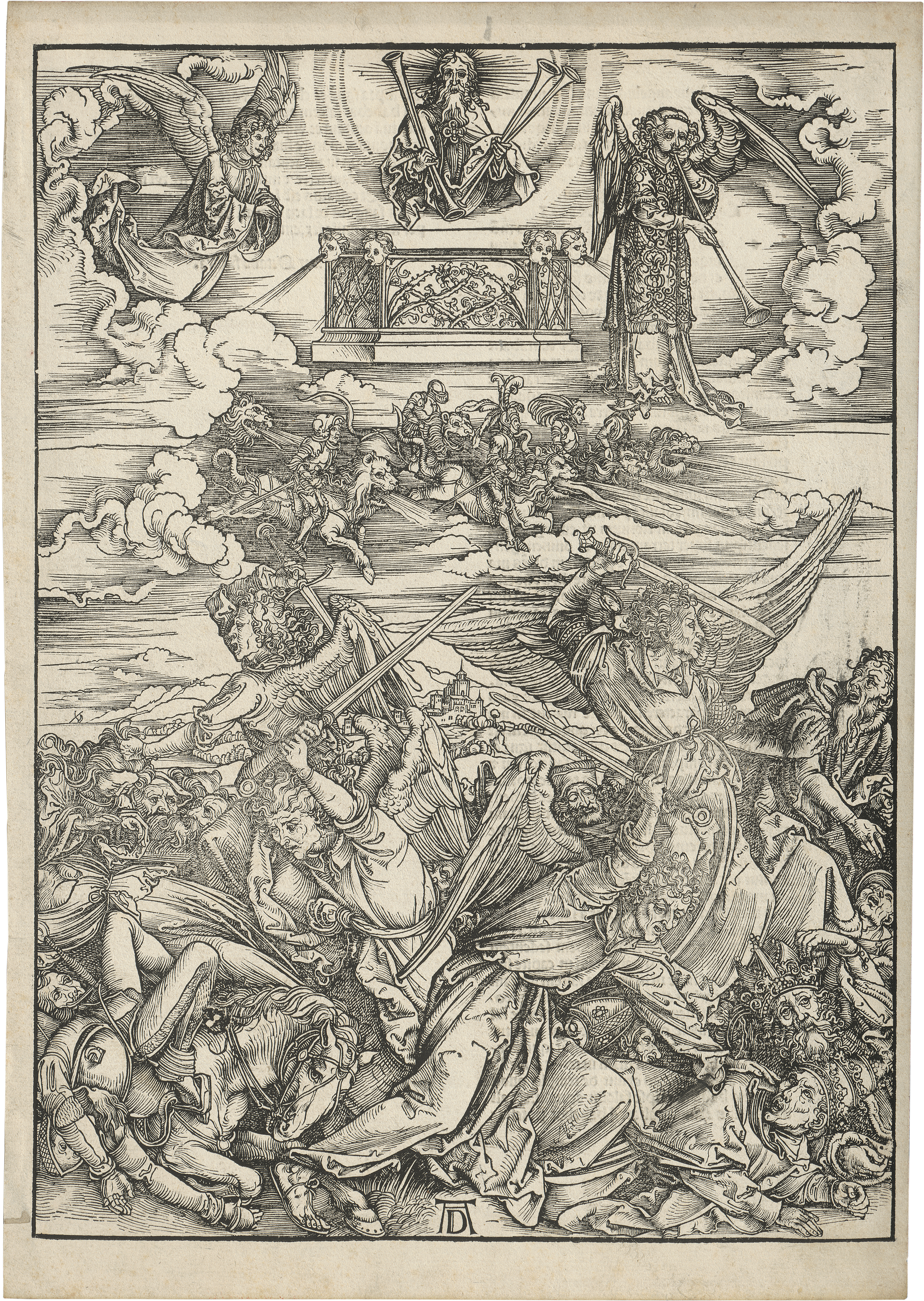 Der Engelkampf. Holzschnitt. 39,5 x 28,4 cm. (1496-1498). B. 69, Meder 171, lateinische Ausgabe von 1511.