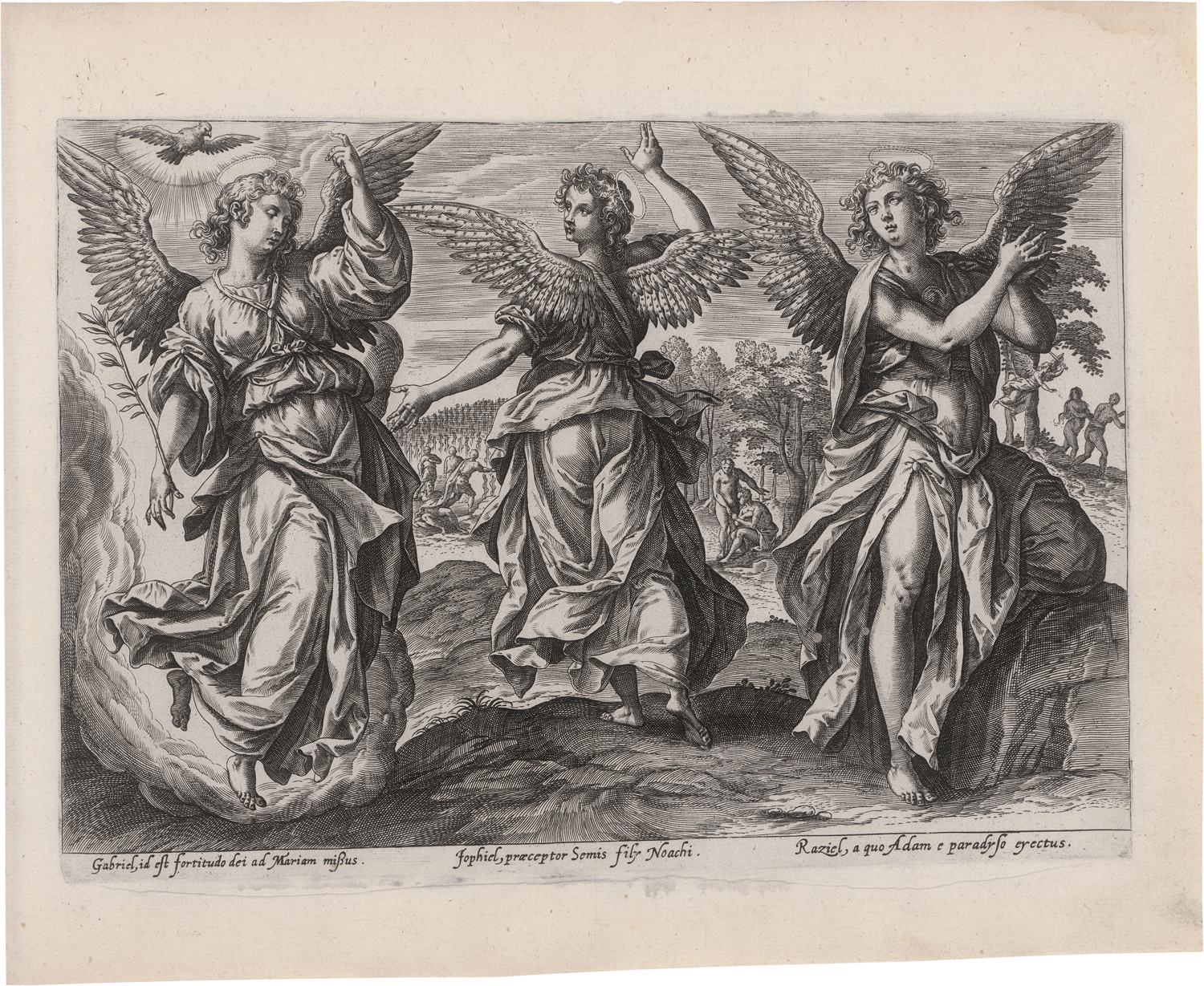 Die schöne, eindrucksvolle Folge ist ein mustergültiges Beispiel für die hohe künstlerische Qualität der Druckgraphik des Antwerpener Manierismus. Die Diener und Boten Gottes sind abwechslungsreich und tänzerisch leicht dargestellt und füllen die Bildfläche mit ihrer ungestümen Energie. Seit den frühen Anfängen der christlichen Glaubenslehre ging man davon aus, dass Engel in einer Art himmlischem Hofstaat organisiert waren, in dem jedem Erzengel eine bestimmte Mission zukam. Um jedoch Parallelen mit der umfangreichen antiken Götterwelt zu vermeiden, wurde später im Mittelalter festgelegt, dass die Verehrung dieser außerirdischen Wesen nur auf die Erzengel Michael, Gabriel und Raphael beschränkt wurde. Dennoch sind hier alle zwölf Erzengel gleichwertig, ohne hierarchische Unterschiede wiedergegeben. - Ganz ausgezeichnete, harmonische Drucke mit gleichmäßigem Rand. Minimale Altersspuren, sonst vorzüglich erhalten.