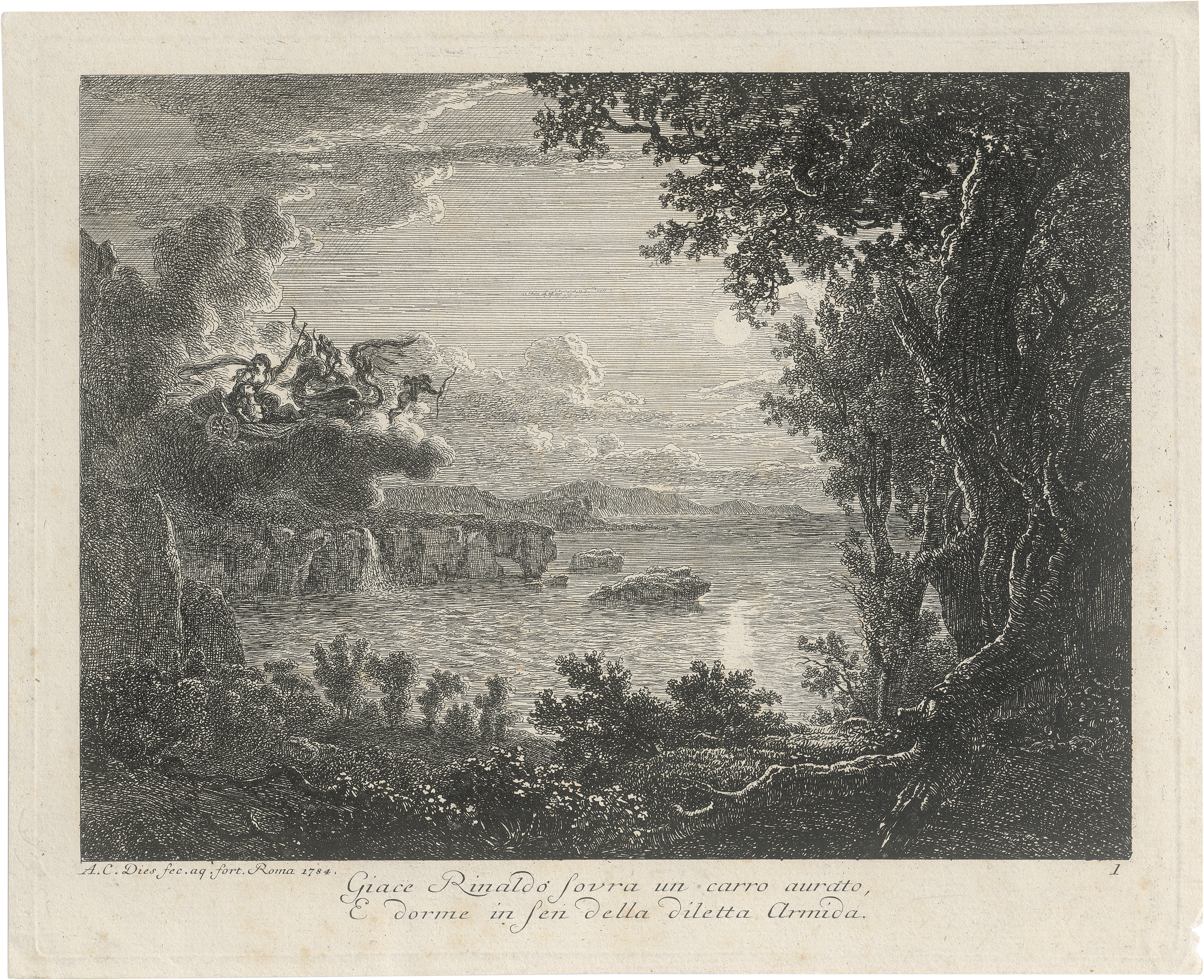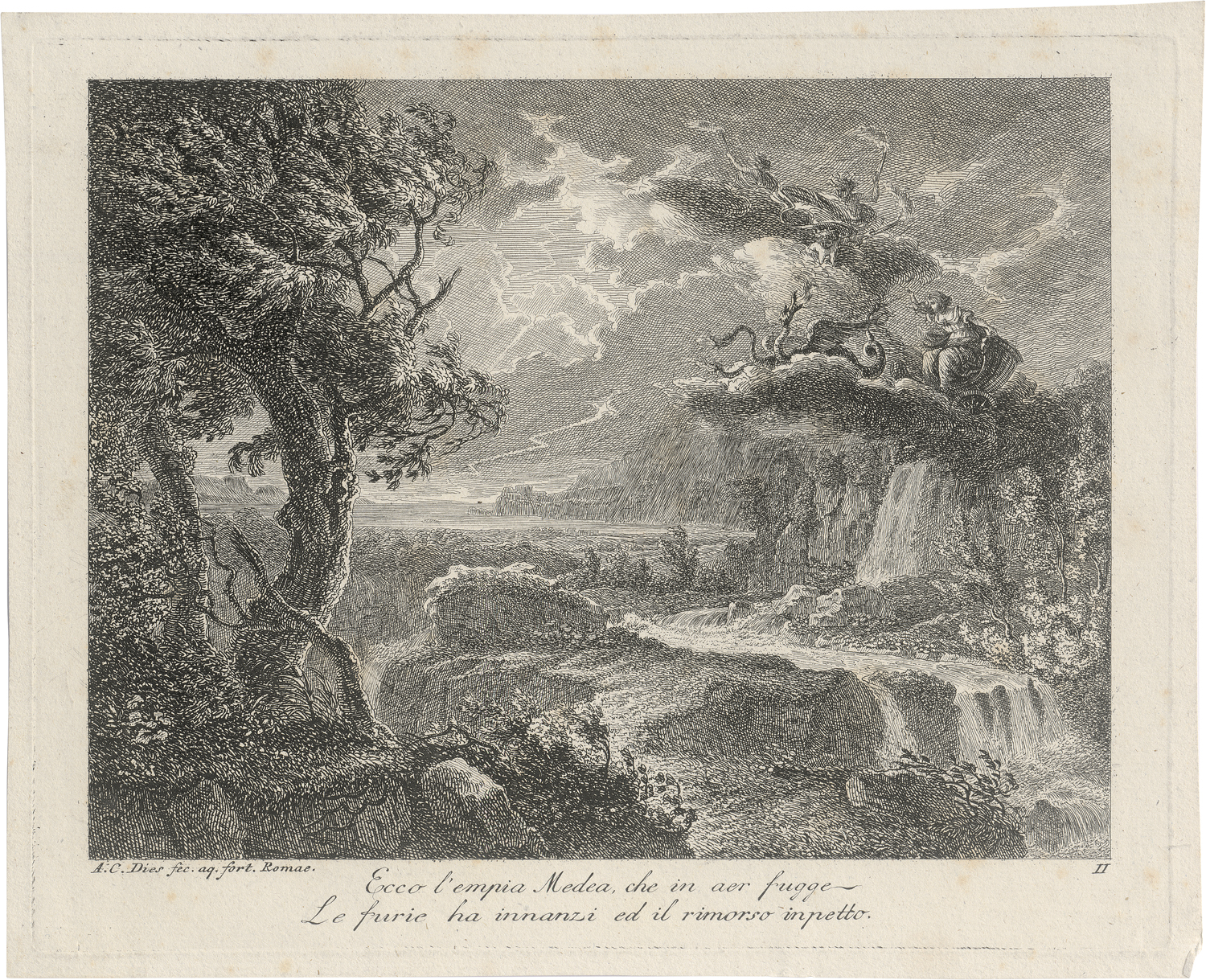 Die Landschaften mit Armida und Medea in den Lüften: Armida und Rinaldo; Medea flieht auf ihrem von Drachen gezogenen Wagen. 2 Radierungen. Je ca. 21,5 x 27 cm. 1784 und 1792. Andresen 1-2, jeweils II.