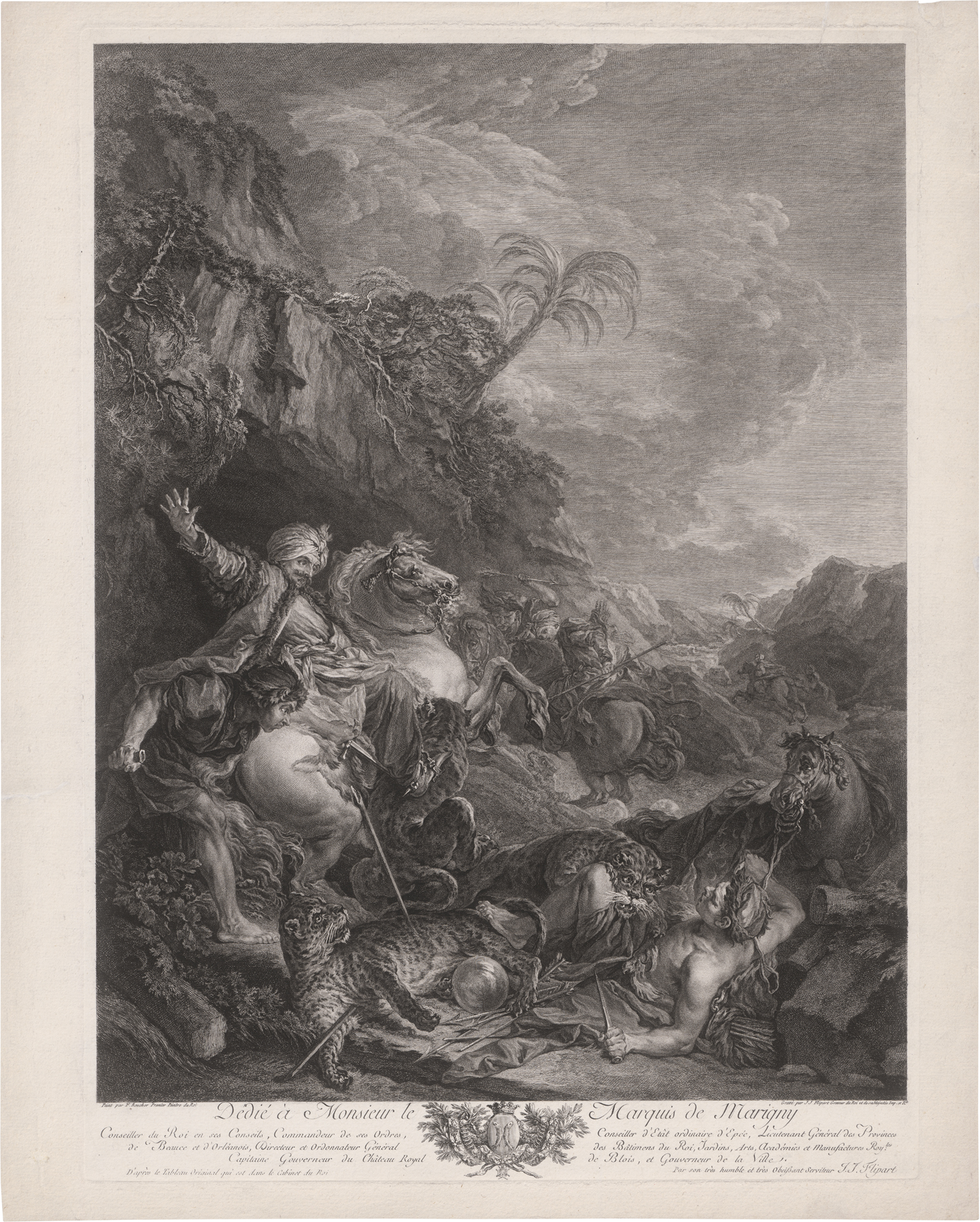 La chasse au tigre (Die Tigerjagd). Radierung, Grabstichel und Kaltnadel nach François Boucher. 51 x 37 cm. 1773. Jean-Richard 1010, IFF 146, Le Blanc 6. Wz. Wappen.