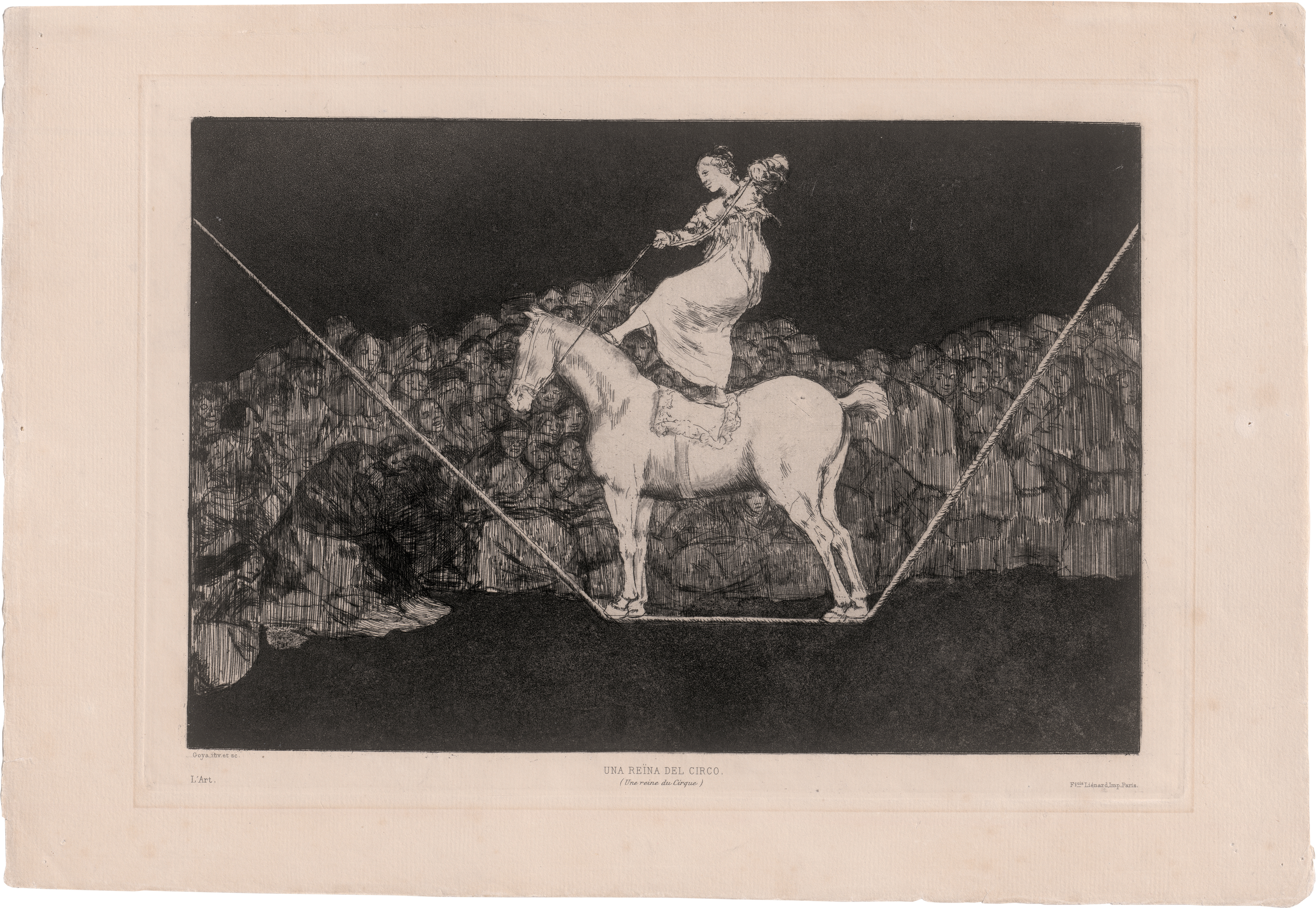 Una Reina del Circo (Disparate Puntual). Aquatintaradierung auf Bütten. 24,1 x 35,4 cm (Plattenrand); 30,2 x 44,5 cm. (Blattgröße). Delteil 221 II (von III), Harris 267 III.