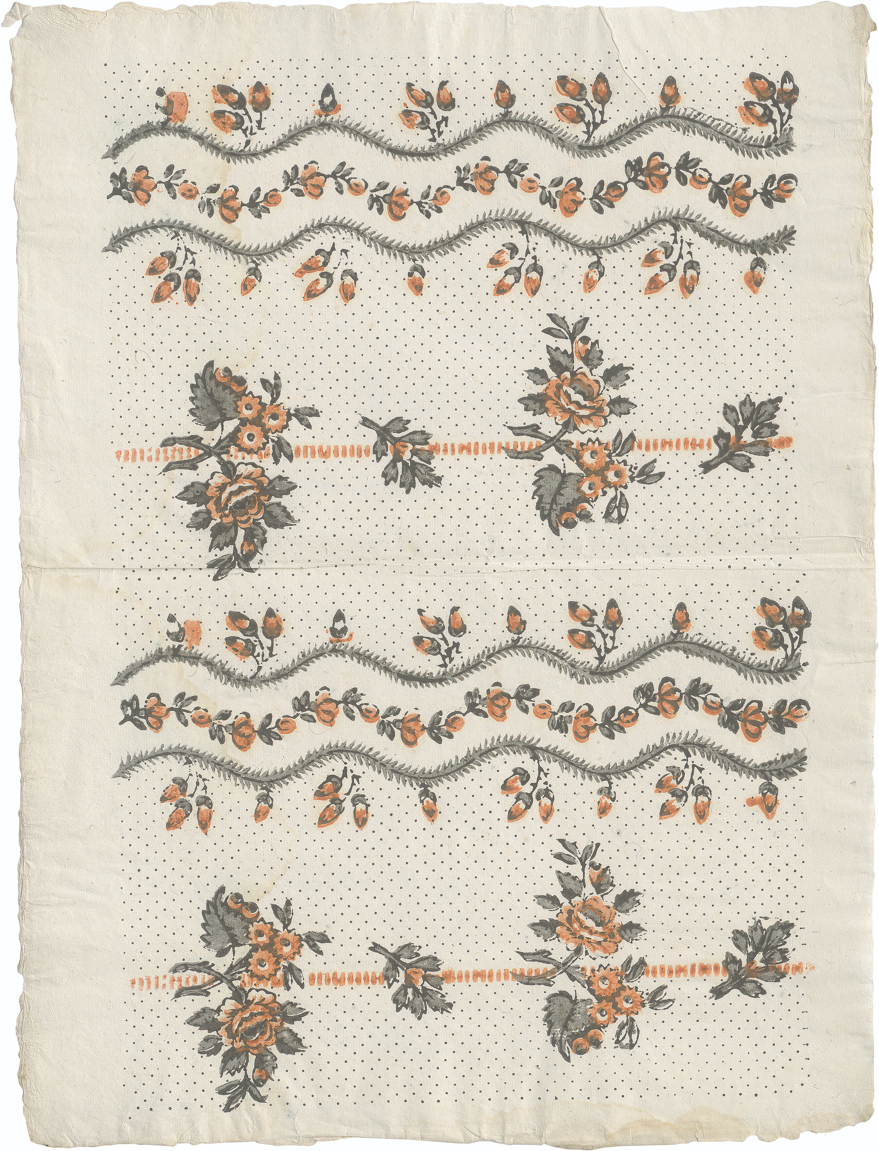 Westdeutsch, um 1760. Kattunpapier. Ranken mit Blütenknospen und Rosenblüten. Orangefarbene, grauschwarze Kleisterfarbe auf Bütten. 36,5 x 48,7 cm. Wz. Buchstaben "GBB".