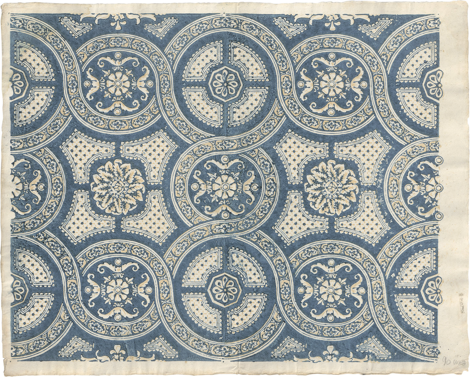 1. Guilloche-Ornament mit sich überlagernden Kreisbändern, gefüllt mit Blumen und Rosenvierpässen in Blau und Gelb auf Velin. - 2. Durchgehende Musterung mit klassizistischen Blumenvasen und Rankenumrahmung in Gelb, Blau, Hell- und Dunkelrosa auf gelatiniertem Büttenpapier. - 3. und 4. Vier üppige Blumenfriese geteilt durch tornierte Bänder in Gelb, Blau Hell- und Dunkelrosa auf Velin, 2 Blatt, je mit dem Trockenstempel von Remondini. - 5. Zwei friesartig angelegte pastorale Landschaften mit Bauern bei der Ernte und Hirte gedruckt in sechs Farben auf Velin. - Sämtlich auf den vollen Bögen, meist mit Schöpfrändern. Vereinzelte Randmängel und ebenda partiell schwach gebräunt, 5) links knitterfaltig und mit kleinem Löchlein, weitere geringe Altersspuren, sonst sämtlich in schöner und originaler Erhaltung. Beigegeben zwei papier peints mit Szenen aus dem Leben der hl. Genovefa.