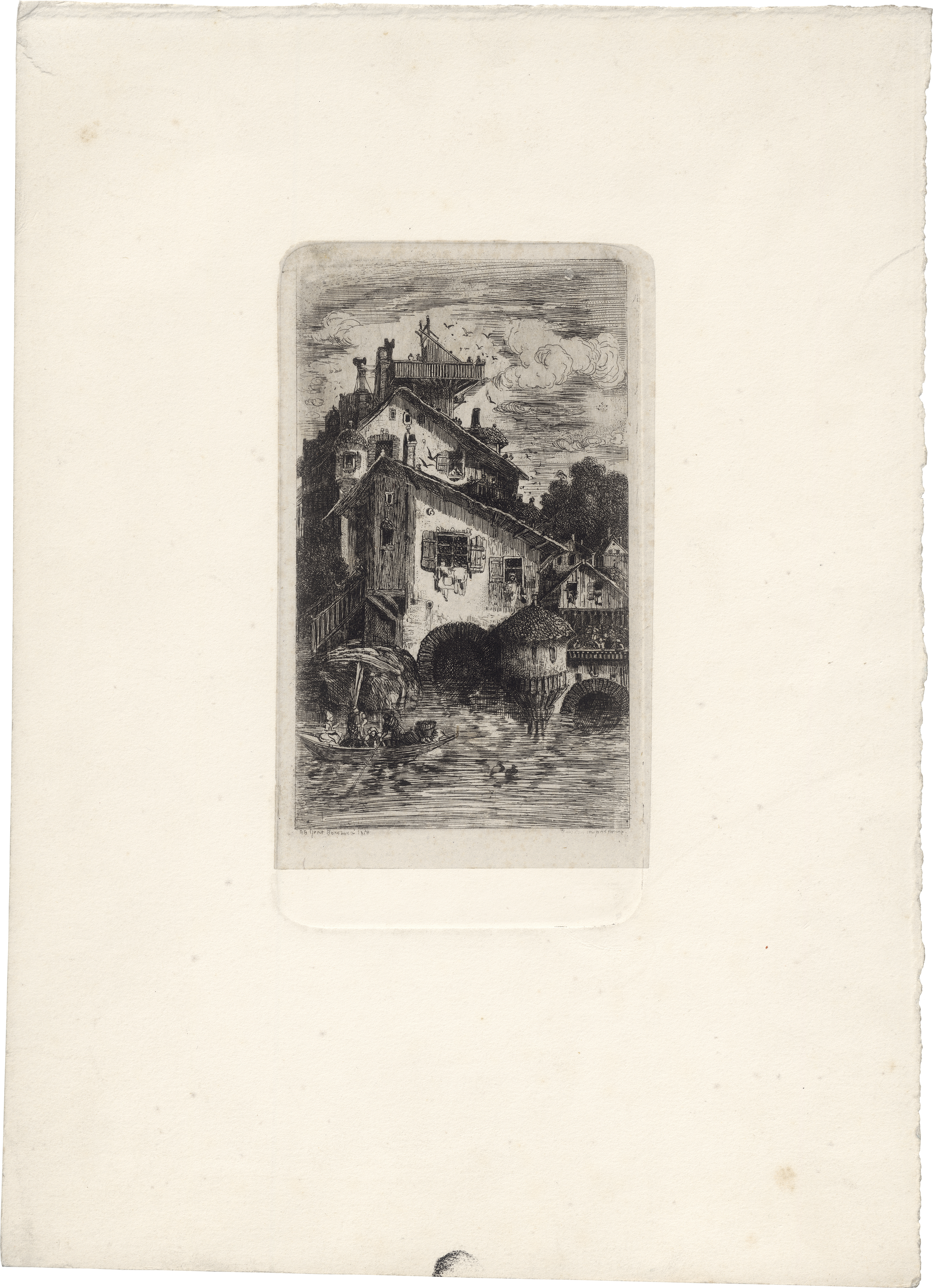 Moulin à eau (Die Mühle am Wasser). Radierung auf gewalztem China. 16,8 x 9 cm. Van Gelder 119 I (von II).