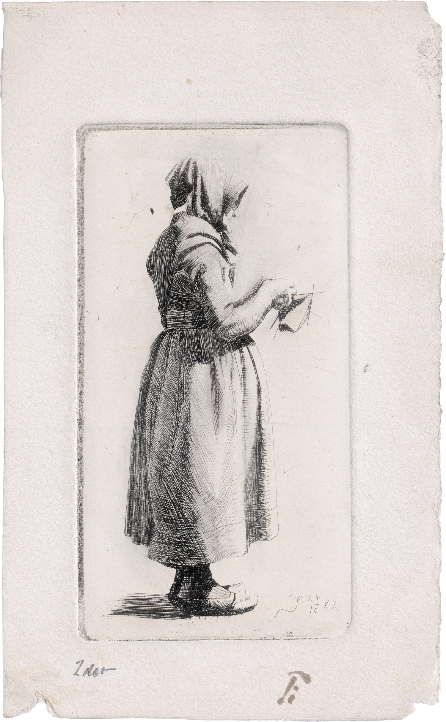Alte Frau, strickend. Radierung, vom Künstler eigenhändig überarbeitet. 12,8 x 6,8 cm. 1882. Unten monogrammiert "Pi" sowie eigenh. bez. "2det [2. Zustand]". Olufsen-Svensson (Radierungen) 4.