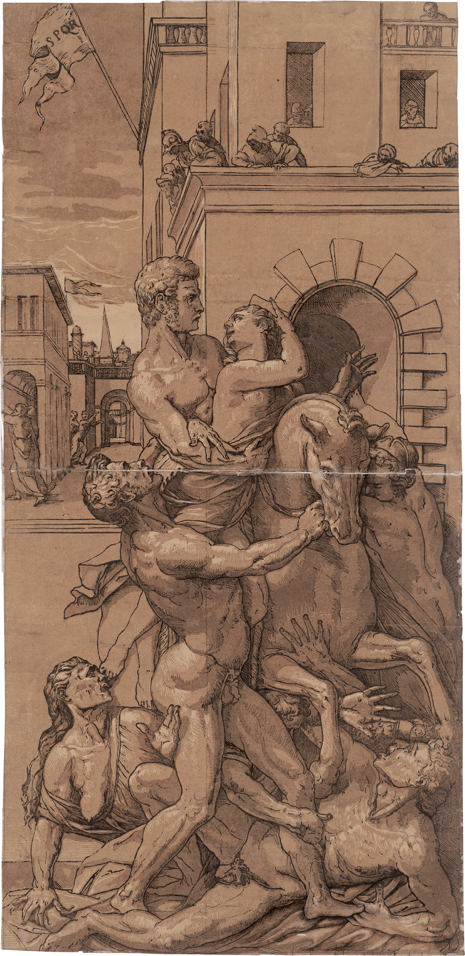 Der Raub der Sabinerinnen (rechte Partie). Clair-obscur-Holzschnitt von vier Blöcken auf zwei zusammengefügten Papierbögen, nach Giambologna. (1585). B. XII, S. 94, 4 wohl I (von II), Rachel A. Young: "Andrea Andreani's Abduction of the Sabine Women after Giambologna", in: Print Quarterly, XLI (2024), Nr. 4, wohl IV (von V). Wz. Adler im Kreis.