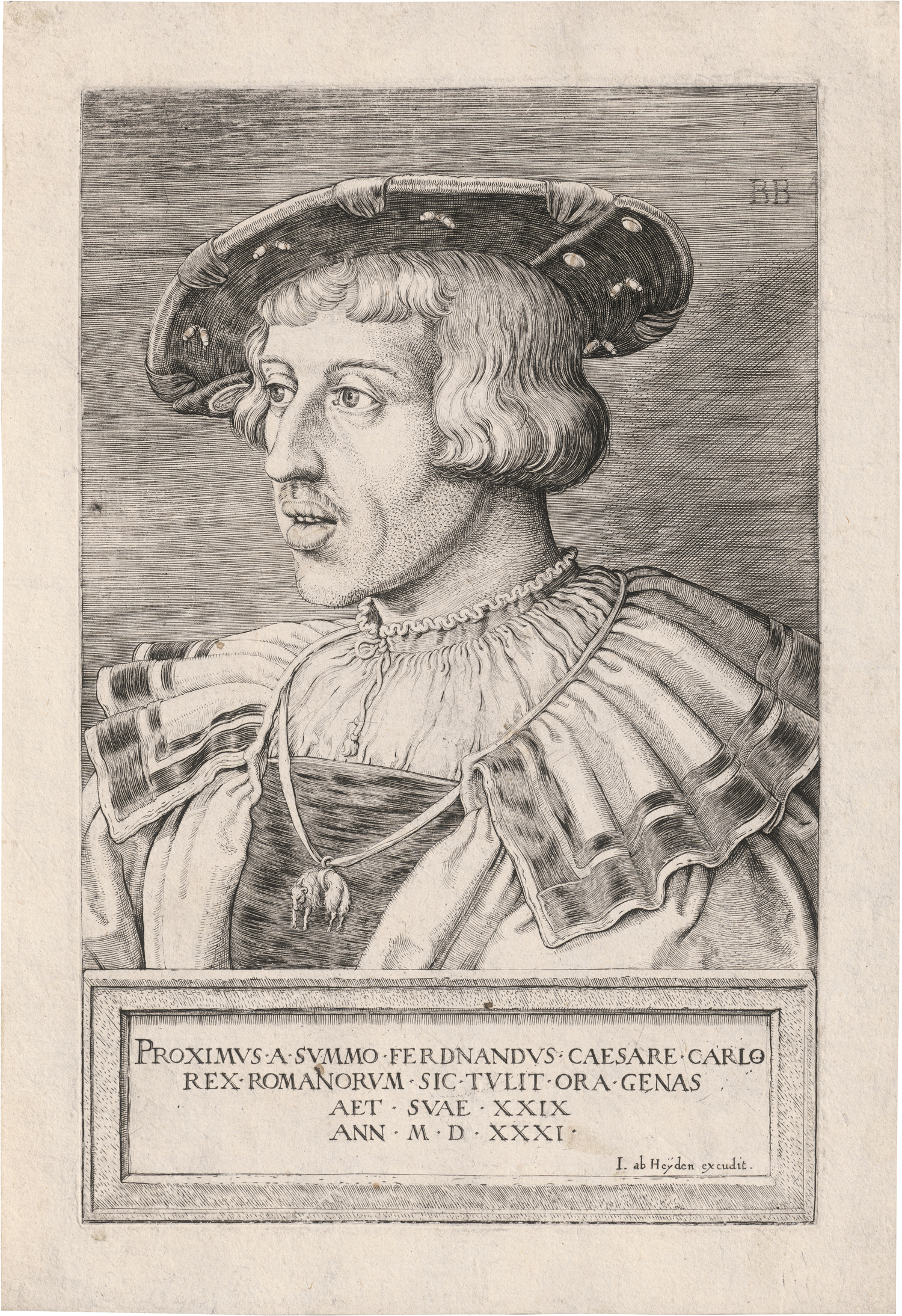 Bildnis Kaiser Ferdinand I. Kupferstich. 20,6 x 13,3 cm. 1531. B. 61, Pauli, Hollstein 91 III, Röver-Kann (New Hollstein) 105 III. Wz. Nebenmarke.