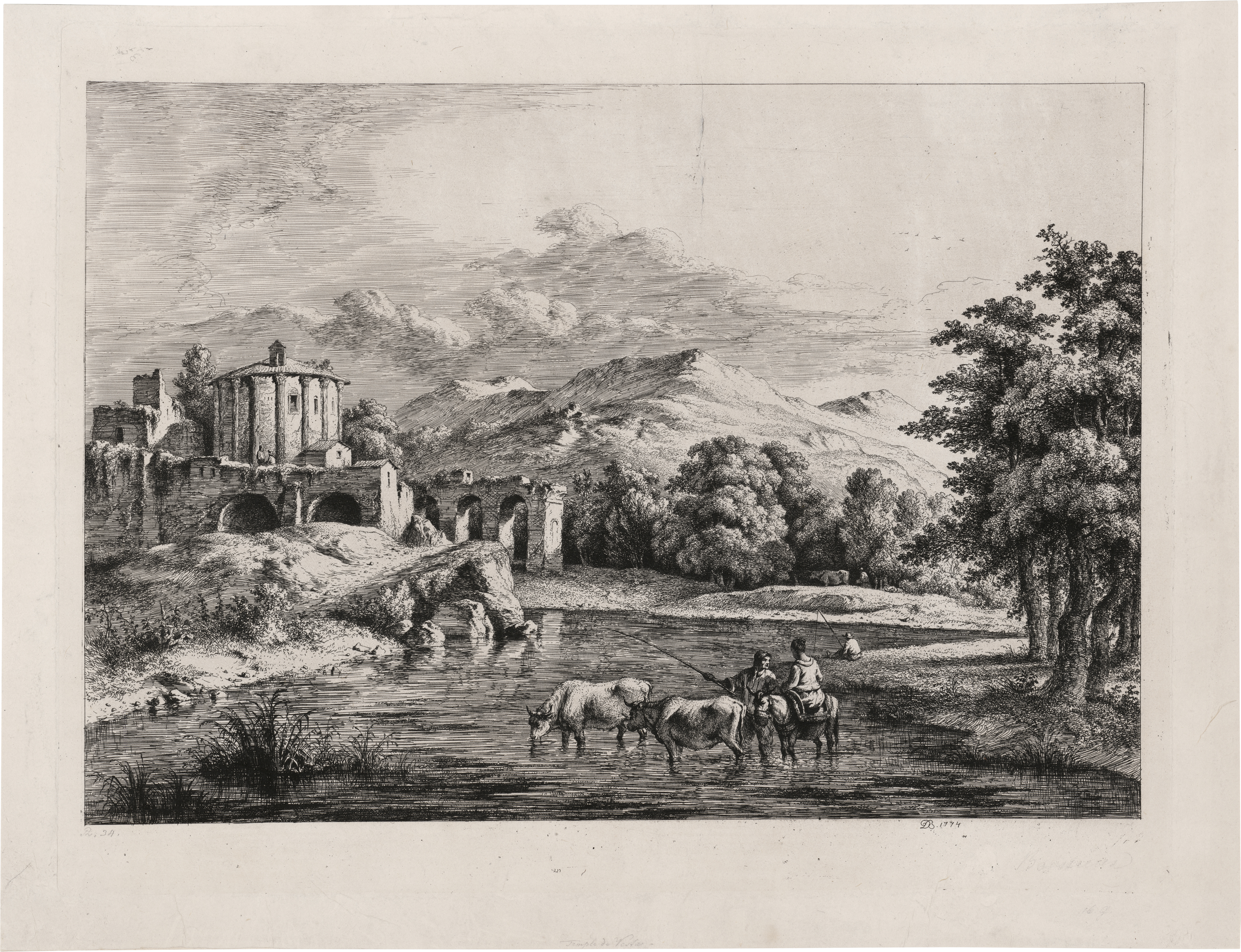 Ganz ausgezeichneter, klarer Druck mit schmalem Rand. Leicht angestaubt, vereinzelt schwache Fältchen, aufgezogen, sonst schön erhalten. Aus der Sammlung Erhard Oskar Kaps (Lugt 3549). Beigegeben von demselben die Radierungen "La Tour de Metellus" (B. 106), "Passage du Garigliano (B. 91) und "Le Maréchal-Ferrant" (B. 137), sowie eine kolorierte Umrissradierung "Vierwaldstättersee mit Tellskapelle".