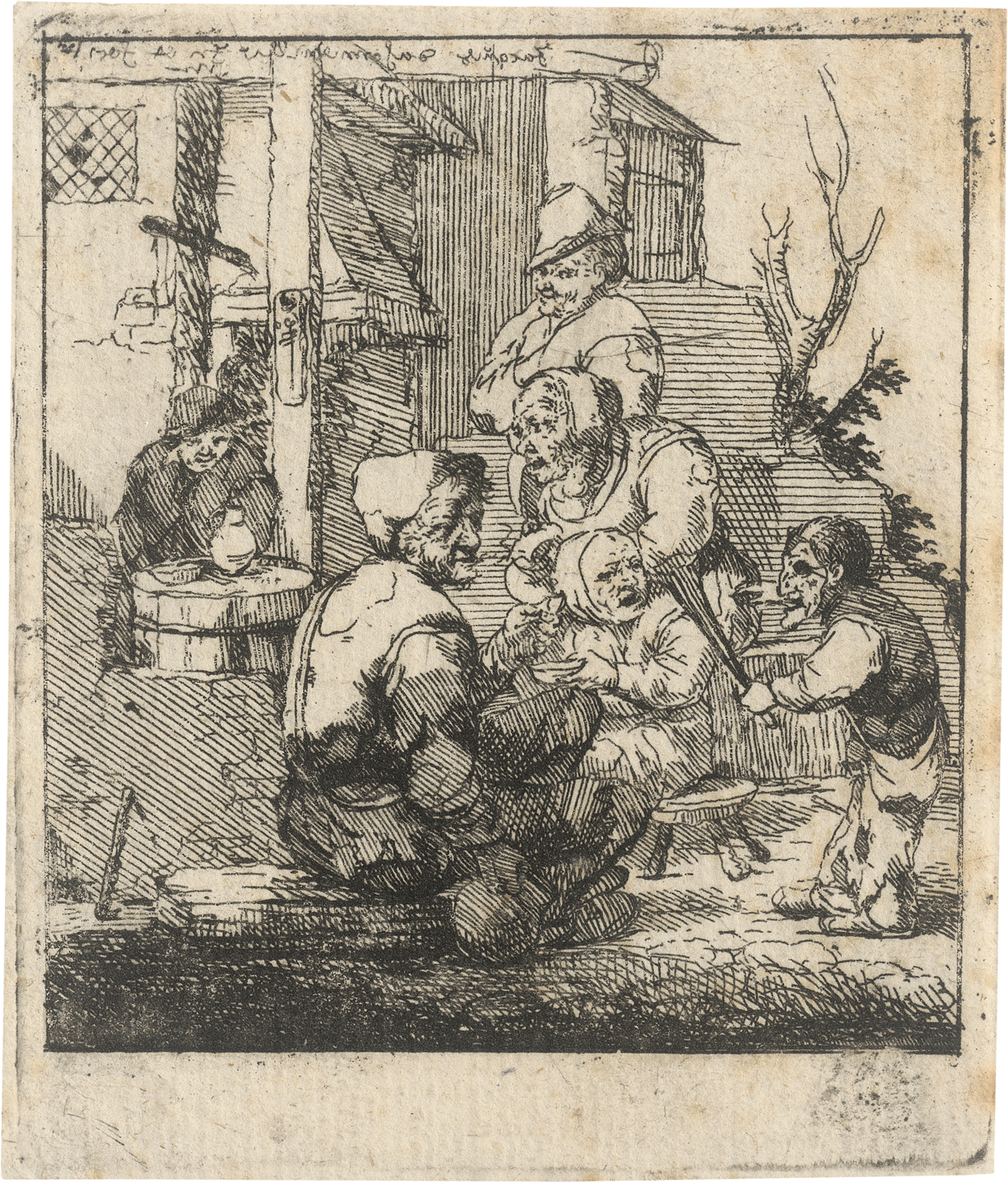 Sechs zerlumpte Bauern vor dem Wirtshaus. Radierung. 7,3 x 6,2 cm. Robert-Dumesnil 3.