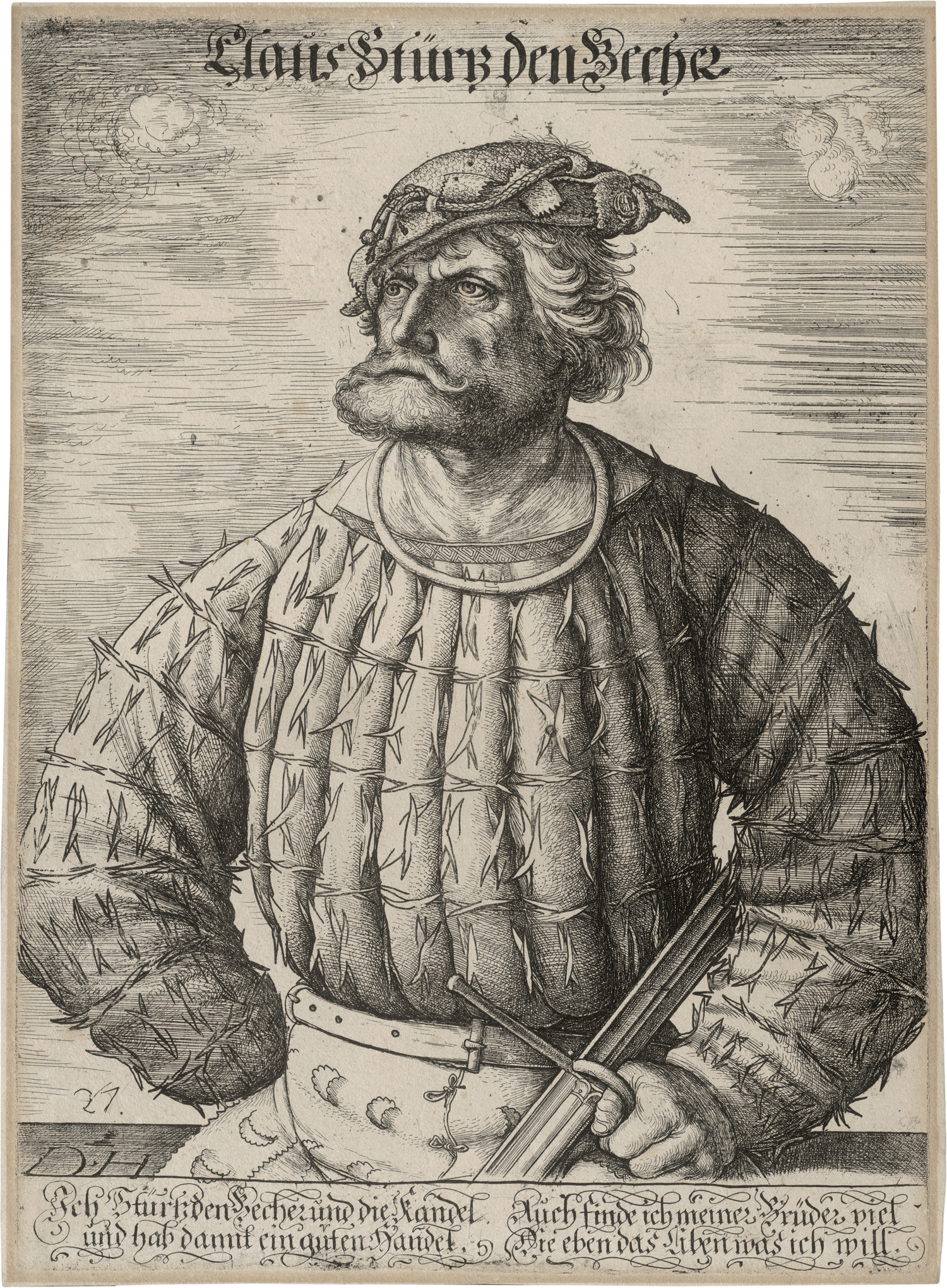 Bildnis des Kuntz (Conrad) von der Rosen, Hofnarr von Maximilian I. Eisenradierung. 29,5 x 21,3 cm. B. 87, Hollstein 97 III (von IV), Metzger 103 VI.