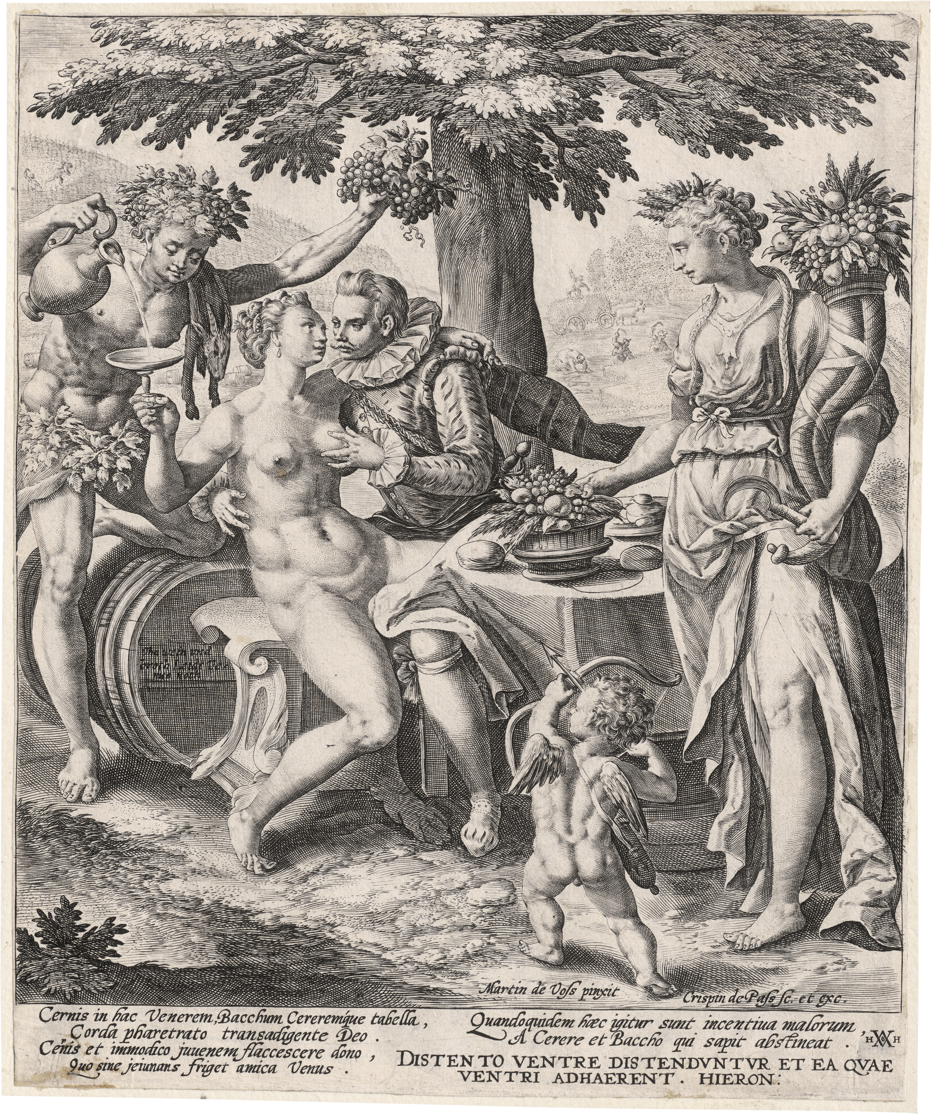 Venus, Ceres und Bacchus (Sine Cerere et Baccho friget Venus). Kupferstich nach Maarten des Vos. 20,9 x 17,4 cm. Hollstein (Passe) 383, Hollstein (de Vos) 1293. Wz. Adler.