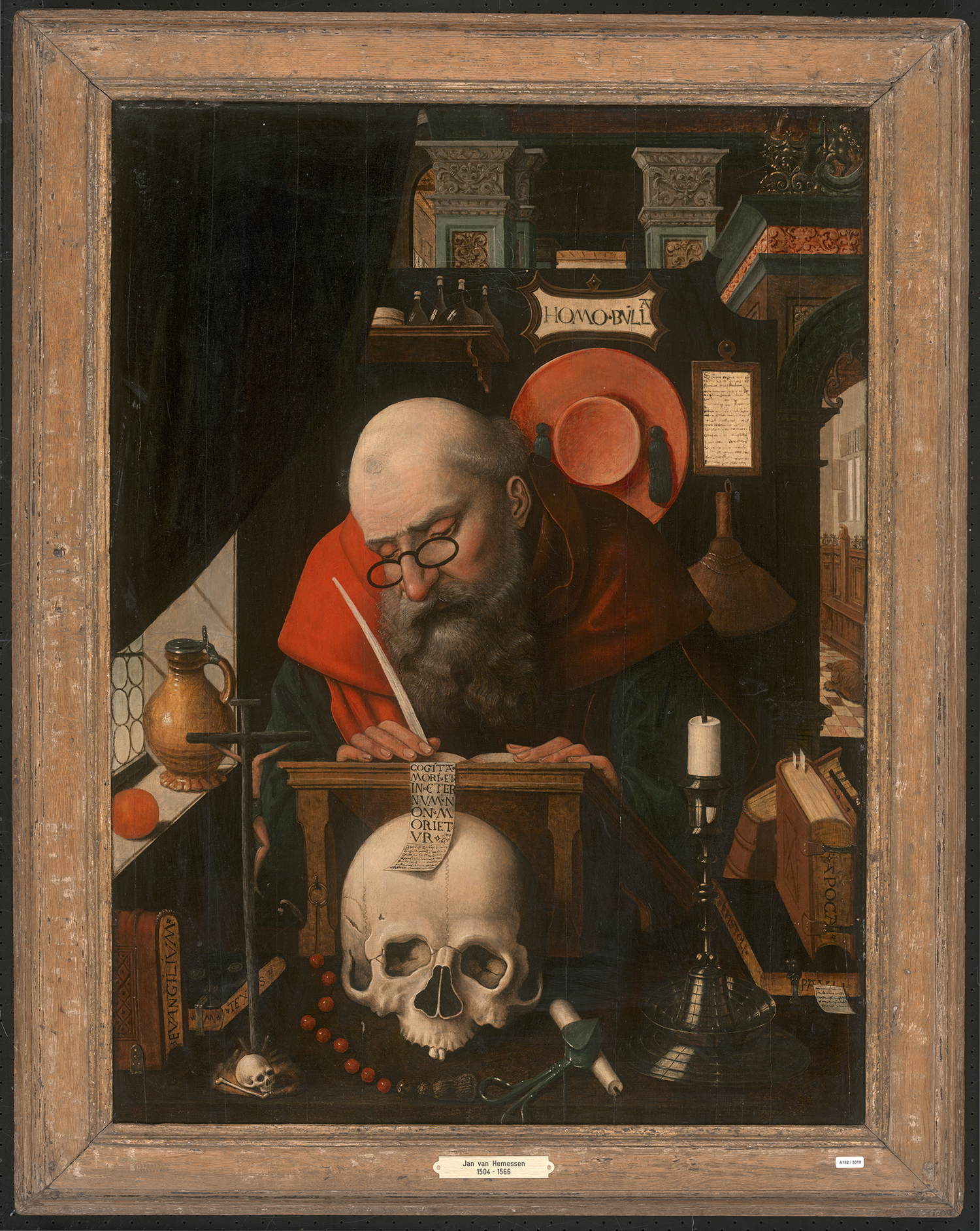 Das Motiv des in der Studierstube schreibenden Hieronymus läßt sich in der Kunst bereits seit dem Mittelalter nachweisen. In Nordeuropa wird die Darstellung vor allem durch Jan van Eyck und später durch Albrecht Dürers Kupferstich maßgeblich verbreitet. Spätestens bei Dürer wird die Raumdarstellung zu einem Hauptthema des Bildes. So widmet sich auch der Künstler des vorliegenden Gemäldes detailliert der Raumsituation und den zahlreichen, die Stube füllenden Details und Gegenständen. Der Heilige sitzt in einer durch eine dünne Holzwand abgetrennten Nische in Klausur. Rechts gibt ein Torbogen den Blick auf einen Flur mit einer kunstvoll geschnitzten Bank frei, und oberhalb der Trennwand sind mit wertvollem Marmor verkleidete Säulen zu erkennen. Das Innere der Kammer ist im Kontrast zur Außenwelt bewusst schlicht gehalten und mit Gegenständen ausgestattet, die Hieronymus als Kirchenvater und Übersetzer des Evangeliums ausweisen. Dabei bleibt das für die Schriften des Hieronymus theologisch prägende - und dem humanistischen Fortschrittsglauben zugleich entgegenlaufende - Thema der inneren Einkehr und der Mahnung an die Vergänglichkeit irdischen Lebens zentral. Neben der titelgebenden Schrifttafel mit dem Sinnspruch „Homo bulla”, was auf Lateinisch „der Mensch ist eine Seifenblase” bedeutet, verweisen zahlreiche Details auf die Vergänglichkeit des menschlichen Daseins: die halb abgebrannte, gelöschte Kerze, die Dochtschere und der markant vor dem Schreibpult positionierte Totenschädel. Hieronymus selbst schreibt auf einem Zettel die Worte „cogita mori et in (a)eternum non morietur”, also etwa „Gedenke des Todes und du wirst nie sterben”. Damit ist gemeint, dass derjenige, der sich zu Lebzeiten seiner Vergänglichkeit bewusst ist und sich der inneren Einkehr sowie den christlichen Idealen verschreibt, das ewige Leben erlangen kann. Die Darstellung folgt somit ganz dem frühneuzeitlichen Verständnis der Hieronymus-Ikonografie. Der Künstler zeigt zugleich in vielen Details sein künstlerisches Können, so zum Beispiel in der gekonnt wiedergegebenen Perspektive und den Spiegelungen des Raumes auf dem glänzenden Metall des Kerzenständers. Die künstlerische Ausführung und die dargestellten Gegenstände wie die markante Brille oder die Flaschen auf dem Regal lassen sich in Form und Stil einem deutschen Meister aus der Mitte des 16. Jahrhunderts zuordnen.