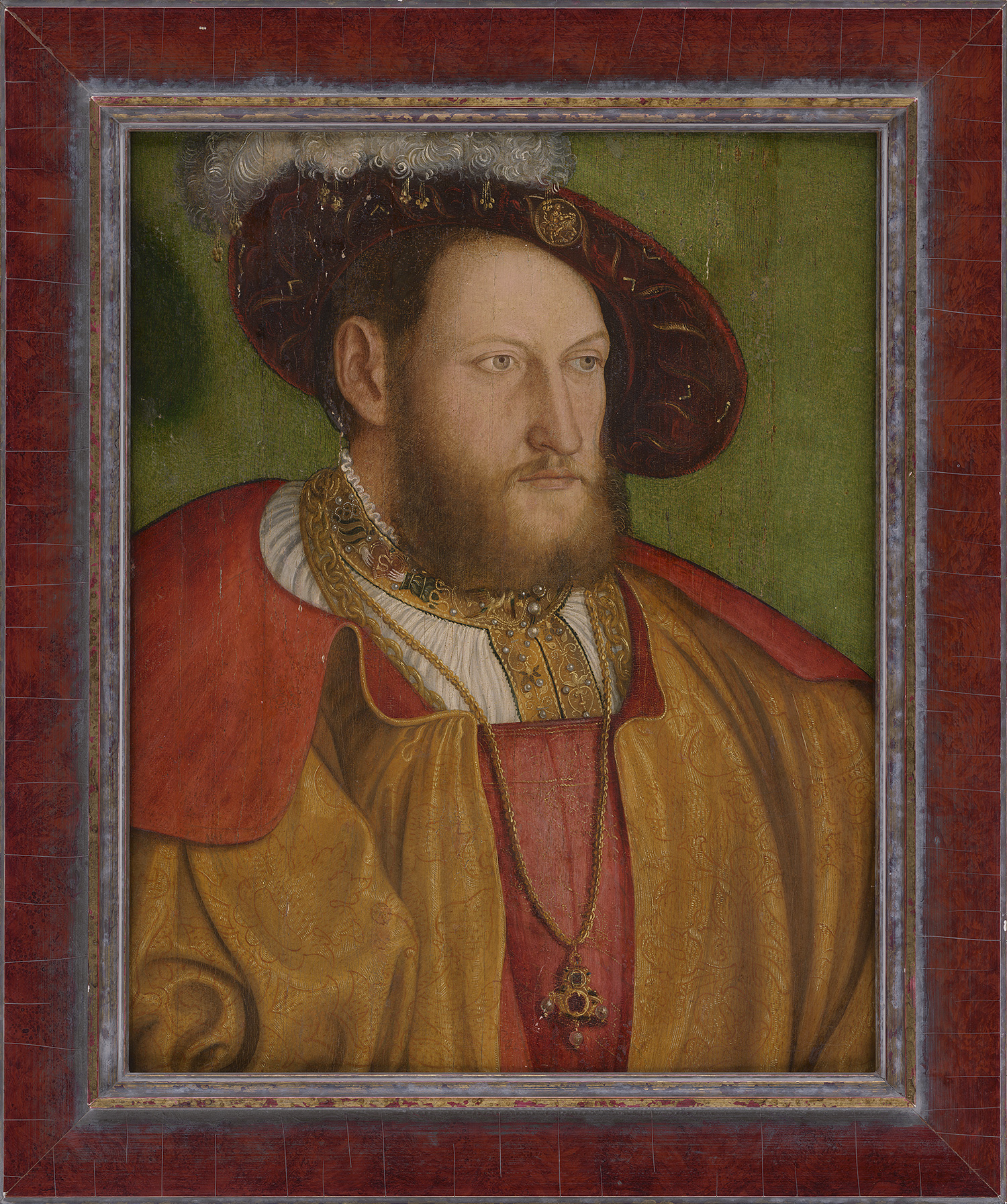 Dieses bislang unbekannte Porträt zeigt unverkennbar den Wittelsbacher Ottheinrich, Herzog von Pfalz-Neuburg (1502-1559) und seit 1556 Kurfürst von der Pfalz. Sein Äußeres ist durch mehrere gesicherte Bildnisse, beispielsweise von Barthel Beham, überliefert, die ihn zudem in vergleichbarer Aufmachung festhalten. In stattlicher Pose erscheint Ottheinrich im Dreiviertelprofil vor monochromen Grund. Sein bärtiges Haupt bedeckt ein schräg aufgesetztes, rotsamtenes Barett, das mit einer weißen Feder und einer goldenen Agraffe geziert ist, die zeigt, wie Samson oder Herkules den Löwen tötet - ein Sinnbild für die Stärke des Fürsten. An Schmuck trägt er zudem eine Goldkette mit einem reich mit Juwelen und Perlen besetzten Anhänger. Der Mantel besteht aus kostbarem Goldbrokat mit Granatapfelmuster. Darunter trägt er ein mit Goldfäden besticktes rotes Wams sowie ein feines weißes Hemd, das mit aufwendiger Gold- und Perlenstickerei verziert ist: Zwei Hände fassen ein rotes Herz, in das mit Goldfäden ein „S“ eingeschrieben ist. Dieses verweist auf seine Gemahlin Susanna von Bayern, Witwe des Markgrafen Kasimir von Brandenburg-Ansbach und Burggräfin von Nürnberg, die Ottheinrich 1529 geehelicht hatte.