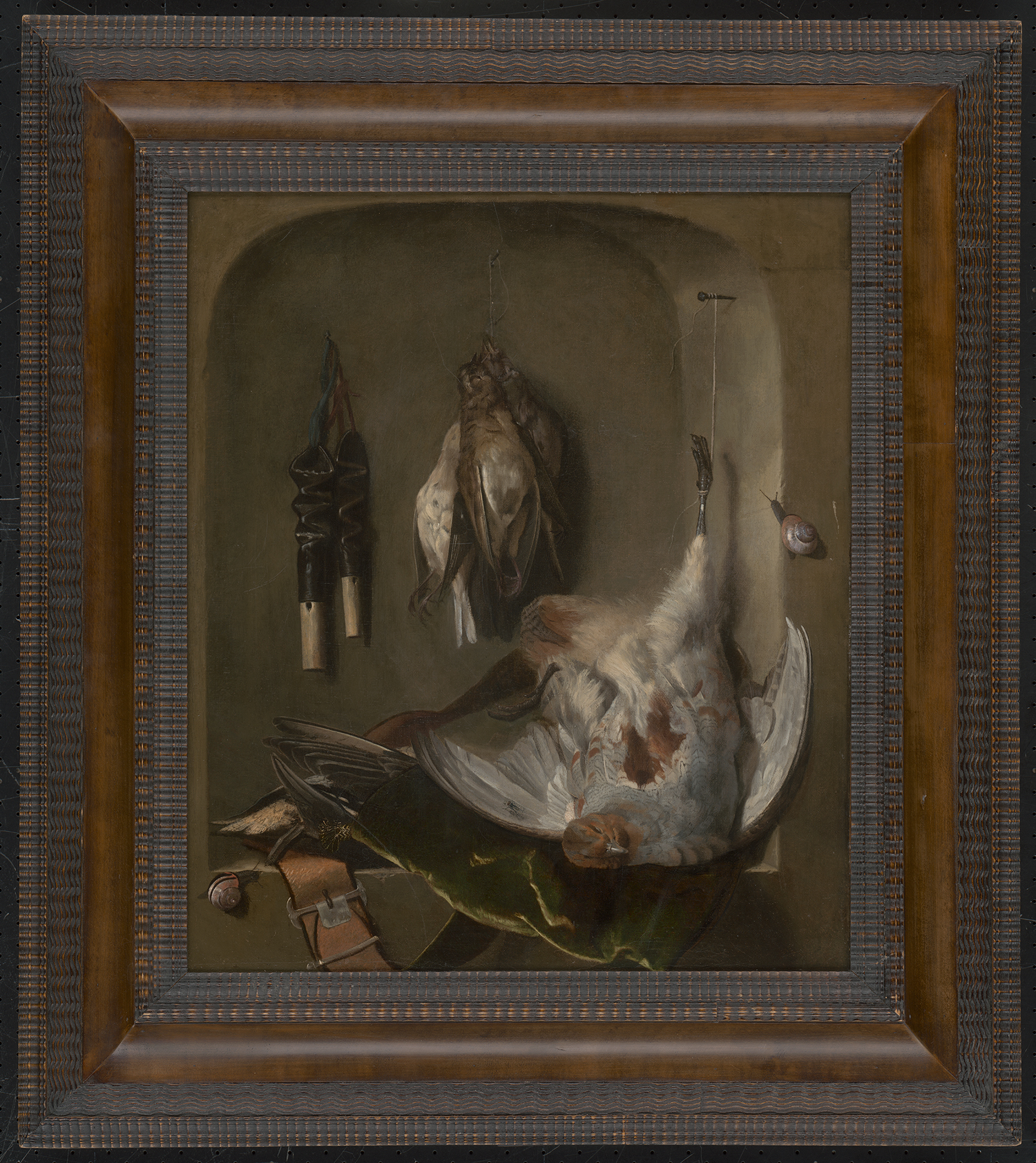 In einer gemalten steinernen Wandnische erblickt man mehrere Vögel, die bei der Jagd erlegt wurden, darunter drei kleinere Singvögel und ein Rebhuhn, das mit einem Fuß an einer Schnur aufgehängt ist. Die Flügel des Rebhuhns sind zur Seite ausgebreitet und geben den Blick auf das raffiniert gemalte Gefieder frei, das die Kunstfertigkeit des Künstlers in der Wiedergabe unterschiedlicher Stofflichkeiten erkennen lässt. An der Rückwand der Nische hängen Jagdflöten, wie sie üblicherweise für die Vogeljagd verwendet wurden.