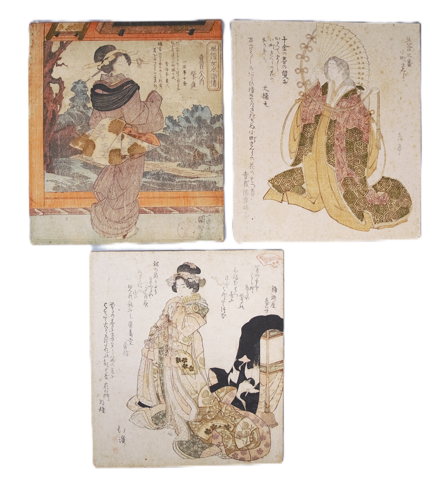 Bijin-ga. Konvolut von 3 Darstellungen von Damen im Kimono. Ukiyo-e Farbholzschnitt teils mit Silberhöhung und auf Japan aufgezogen. Format Chūban tate-e. 20,5 x 18cm (Darstellung). Edo (Tokio) 1840.