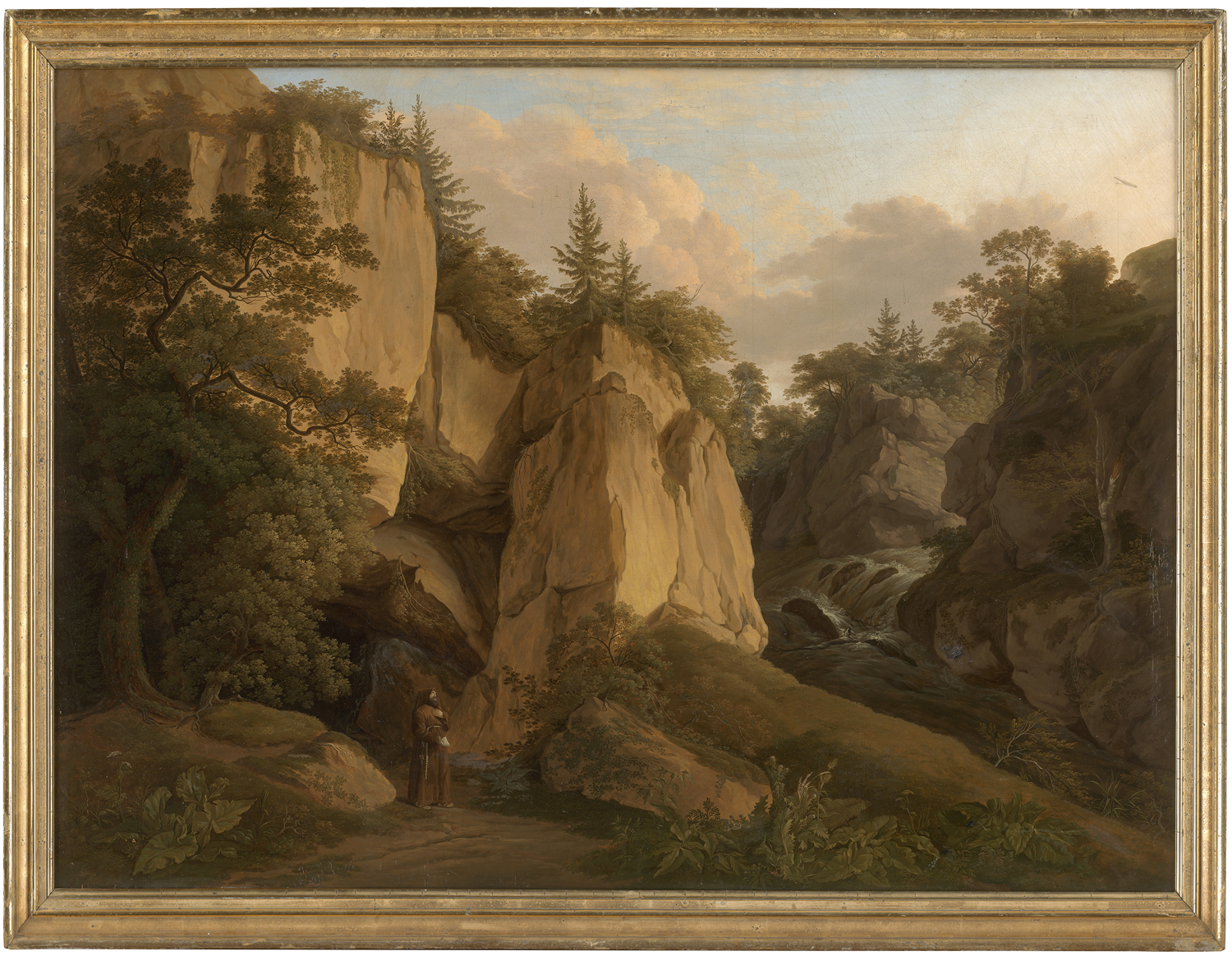Obwohl Anton Radl zunächst als Zeichner und Radierer bei Johann Gottlieb Prestel in die Lehre gegangen war, wurde er nach 1800 vor allem als Landschaftsmaler bekannt. Er widmete sich in seinen an der Malerei der niederländischen Meister orientierten Landschaften gerne Gegenden aus der Umgebung von Frankfurt oder dem Taunus, griff aber zuweilen auch auf Landschaftseindrücke zurück, die er auf seinen Studienreisen nach Norddeutschland, in den Schwarzwald, die Schweiz und entlang der Donau besucht hatte. Das vorliegende Gemälde wiederholt ein Motiv seines bekannten Bildes im Historischen Museum Frankfurt aus dem Jahre 1812, das schon auf der großen Ausstellung 1827 prominent präsentiert wurde (vgl. Ausst. Kat. Anton Radl, Historisches Museum Frankfurt a.M. 2008, S. 64, Nr. 12). Wir danken Dr. Anke Fröhlich-Schauseil für wertvolle Hinweise.