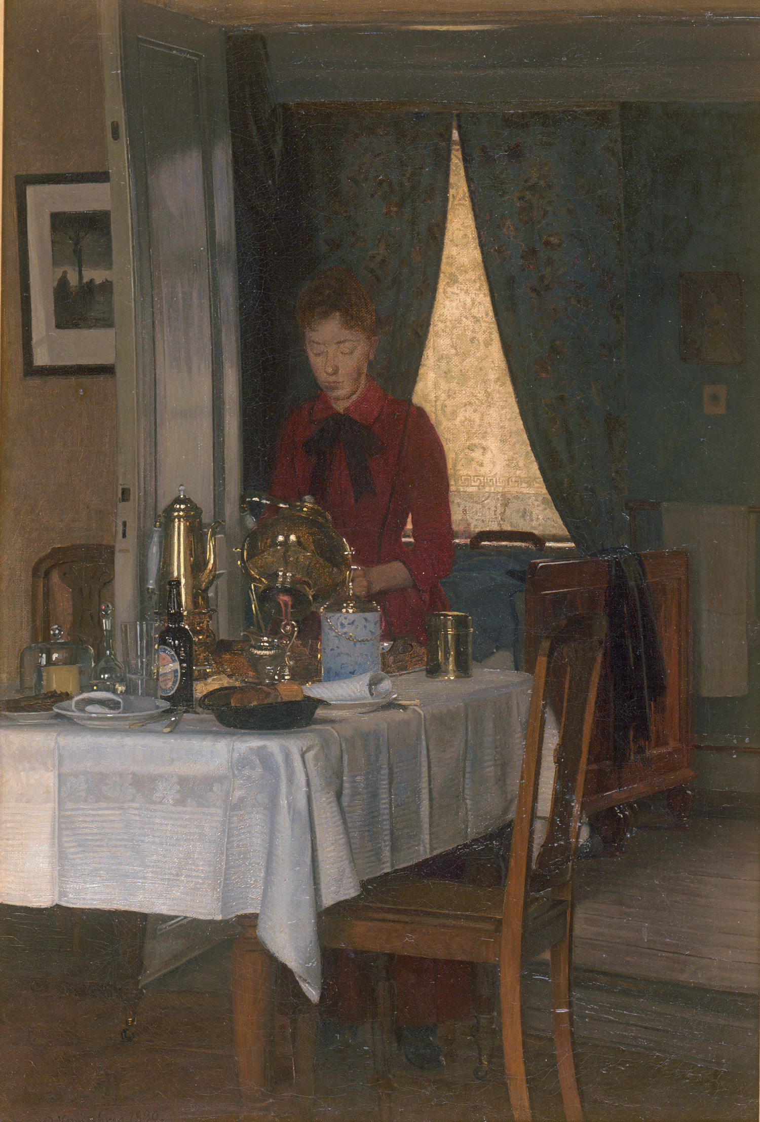 Ved Kaffen - Interieur mit junger Frau, die Kaffee am gedeckten Tisch zubereitet