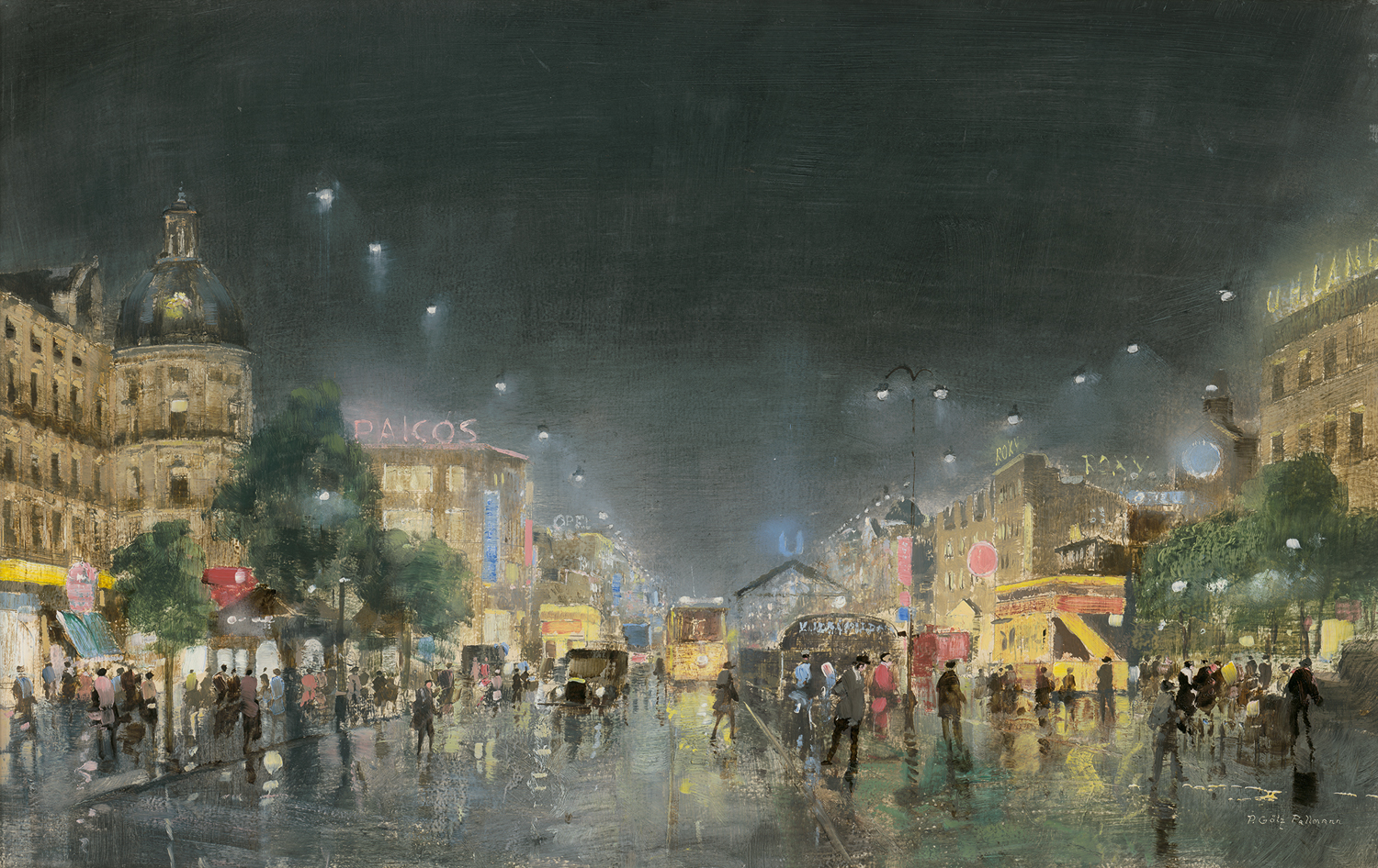 Das Gemälde stellt das rege Treiben auf dem hell erleuchteten Berliner Kurfürstendamm auf Höhe der Uhlandstraße dar. Gut zu erkennen ist links das heutige Maison de France mit der berühmten Paicos-Zigaretten-Werbung, sowie zur Rechten die Leuchtreklamen des Roxy und des Haus Uhland, sowie der U-Bahnhof und die noch bis 1954 dort fahrende Straßenbahn.