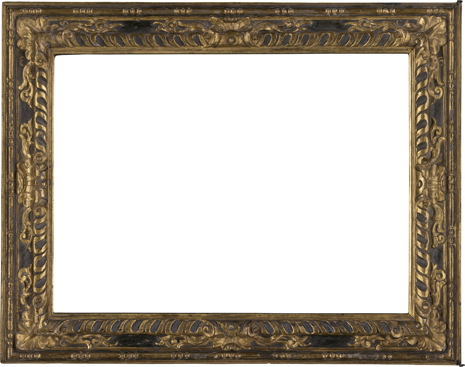 geschnitzt, ebonisiert und vergoldet, Sichtleiste glattes ansteigendes Profil, Wulstprofil mit Bandelementen und Blättern in den Ecken und Mitten, Astragal, abfallendes Profil als Abschluss. Mit Aufhänger.