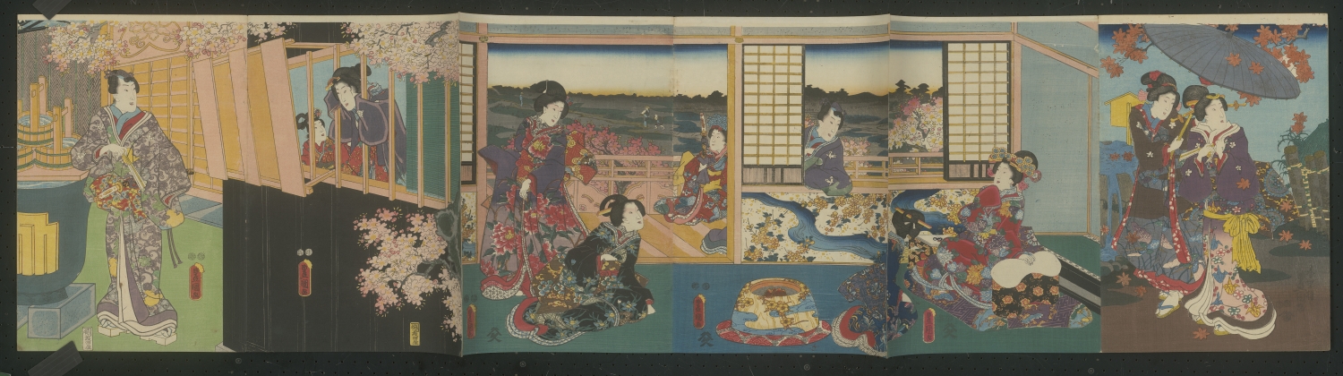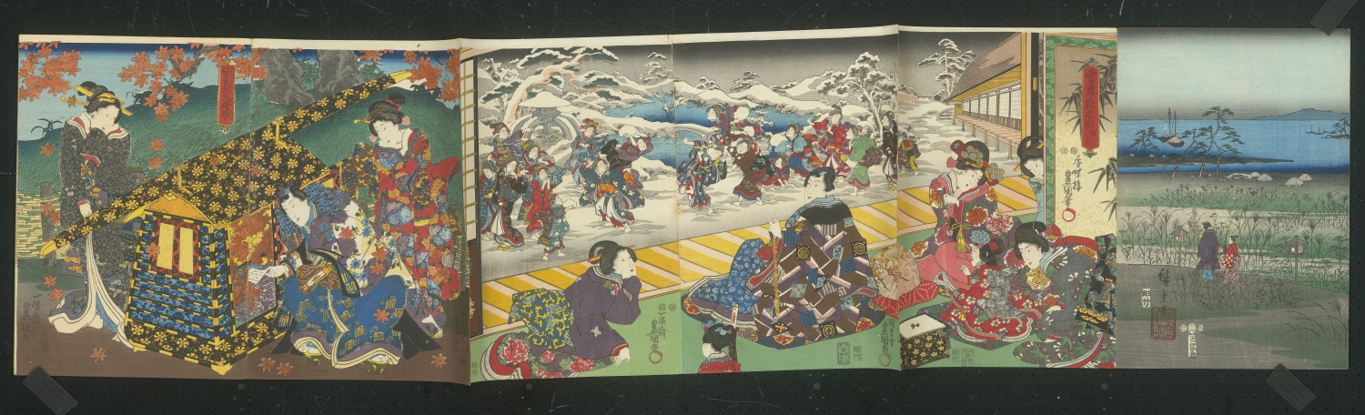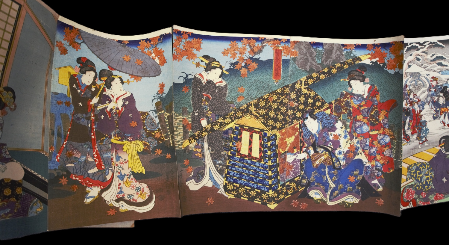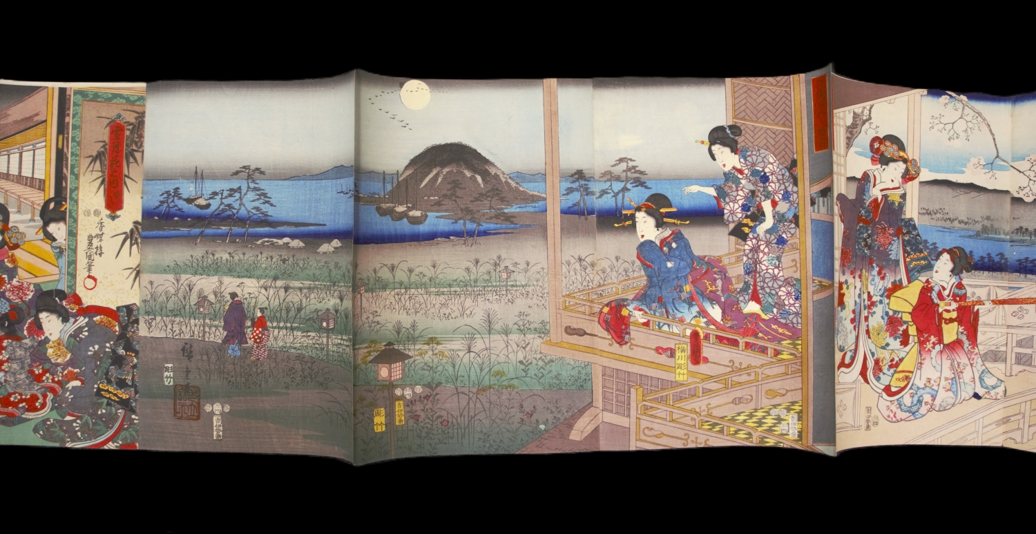Die Blätter zeigen eine Bandbreite dekorativer und theatralischer Kompositionen: vornehmlich Gruppenbildnisse; Szenen aus Legenden und dem Kabuki-Theater mit heroischen Gestalten und eleganten Bijin. Diese in prachtvoll gemusterten, kostbaren Kimonos gewandet - dargestellt in atmosphärisch Szenerien: bei Schnee, unter Regenschleiern, zwischen herabgleitenden Ahornblättern oder blühenden Kirschbäumen; sowohl in opulenten Interieurs als auch in ausgedehnten Landschaften, bei Tageslicht oder auch bei Mondschein. – Die Triptycha sind teils in den Falzstellen gebrochen und das Leporello ist in drei Teilen erhalten. Die Ecken sind teils etwas bestoßen. Nur vereinzelt minimale Stockflecken und winzige Löchlein, überwiegend im Bereich der Falze, insgesamt in guter Erhaltung und die Farben in bemerkenswerter Frische.