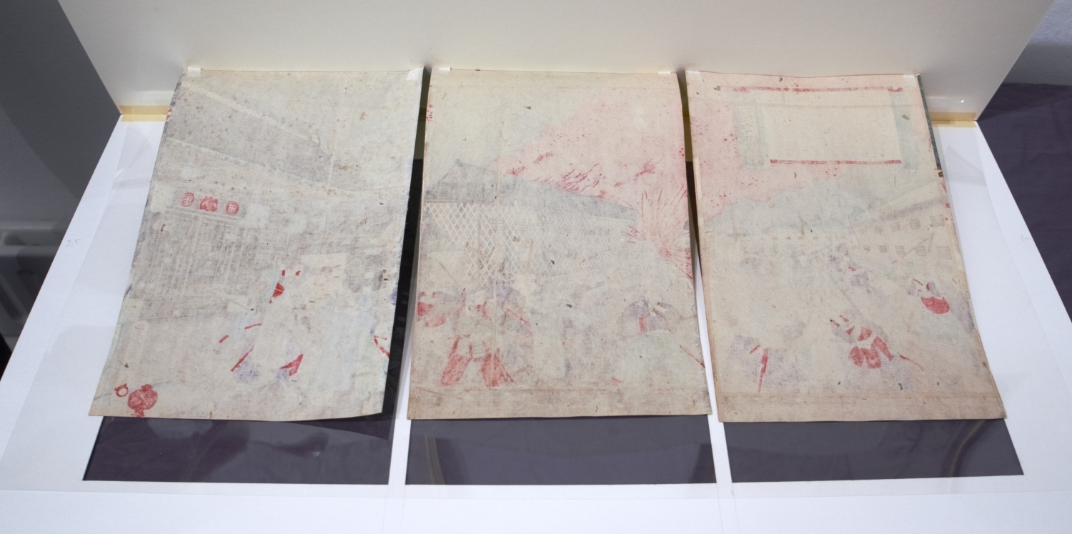 Kuniteru, Utagawa. Die Brandstiftung in der Residenz von Satsuma. 3 Ukiyo-e Farbholzschnitte im Triptychon aus der Serie "Eine kurze Geschichte der Neuzeit". Format ôban tate-e. 1 Blatt: 35 x 23 cm. Mit Passepartout in Holzprofilleiste. Edo (Tokio) um 1870.