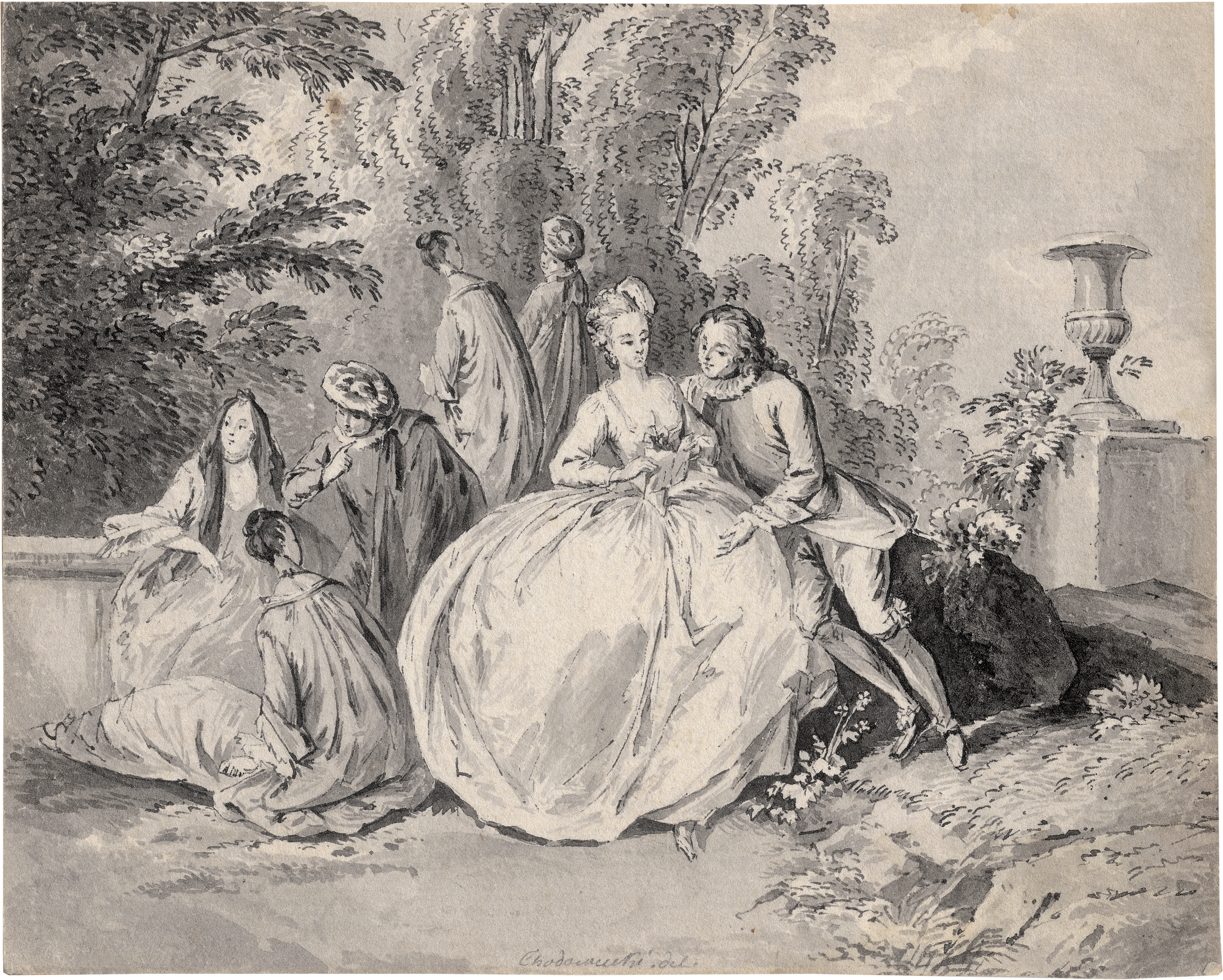Feder in Grau, grau laviert, auf Bütten. 9 x 11,2 cm. Am Unterrand signiert "Chodowiecki del.".