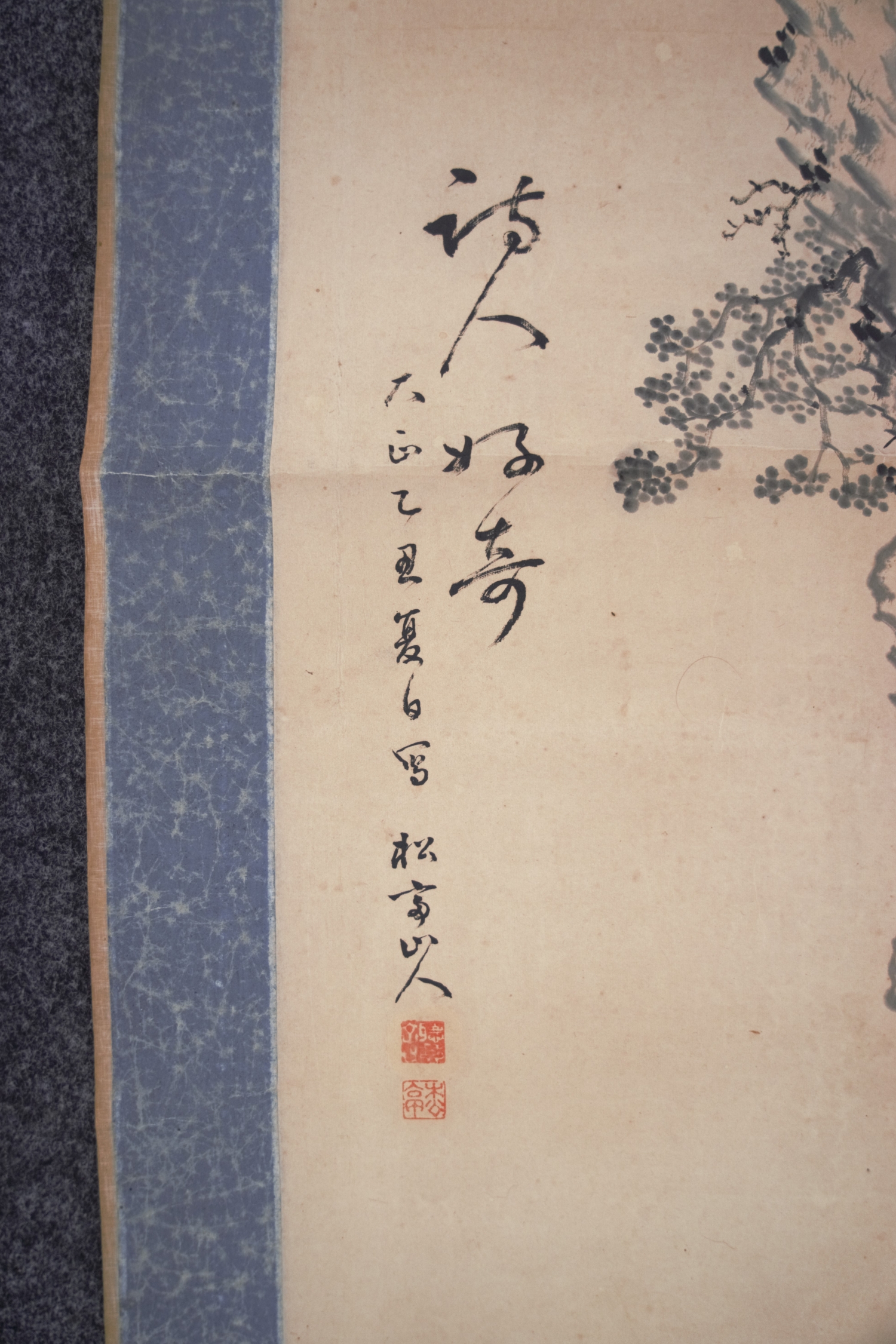 Vier dekorative Felslandschaften in Pinselmalerei, darunter Szenen mit einem einsamen Angler, einem Wanderer, einer Figur in einem Gartenbauwerk sowie zwei fliegenden Sperlingen. Zwei Rollen stammen aus dem späten 19. Jahrhundert, eine weitere ist eine moderne Touristenproduktion. – Die älteren Rollen weisen deutliche Rollspuren und Stockflecken sowie Oberflächenabrieb auf. Aufgezogen auf Leinen oder Papier.