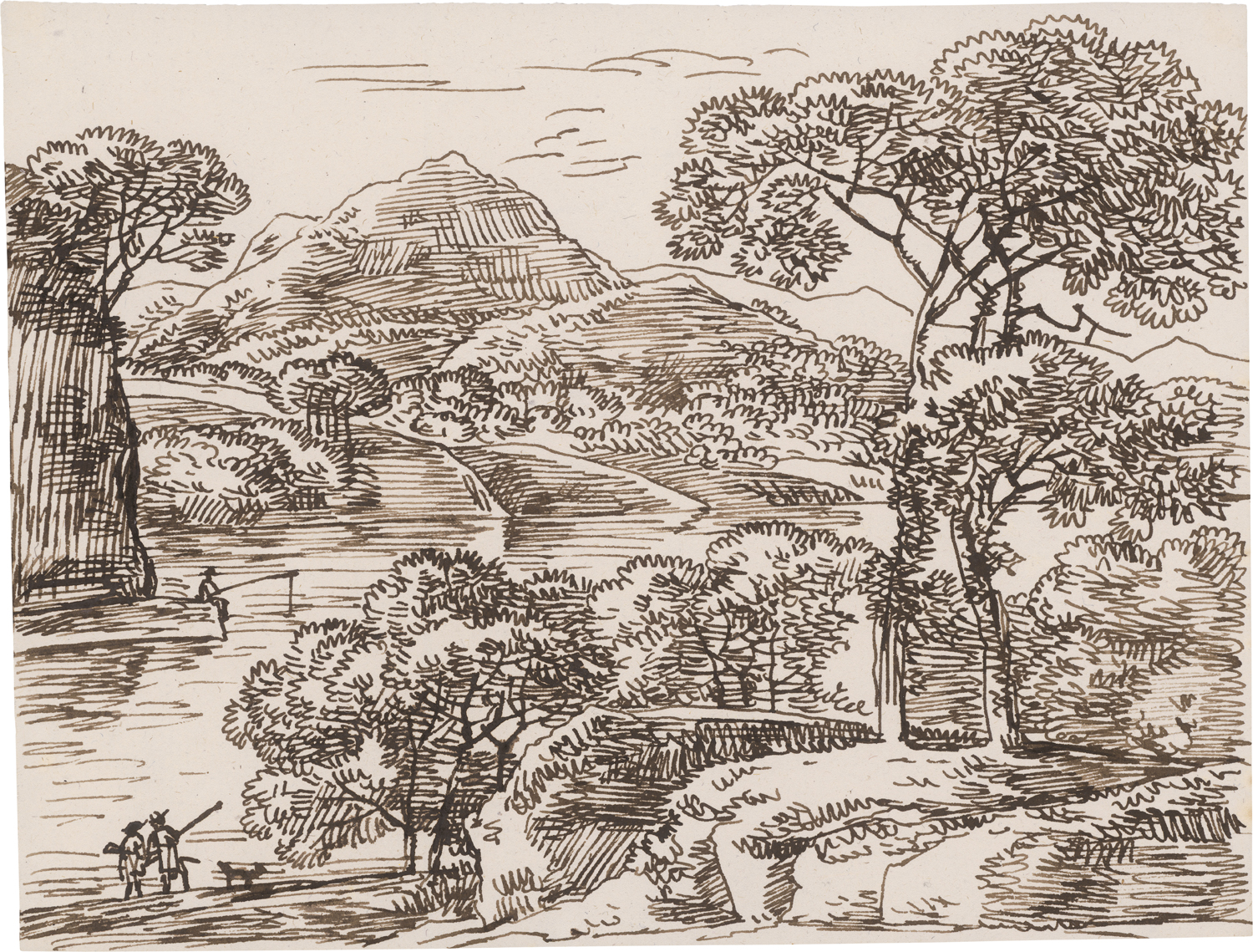 11 Zeichnungen in brauner Feder, je montiert auf blauem Bütten, lose in marmoriertem HLederdeckel des 18. Jh. (berieben, mit kl. Schadspuren) mit ornamentaler Rückenvergoldung und Schild). 8,5 x 9,5 cm - 15,2 x 19,7 cm.