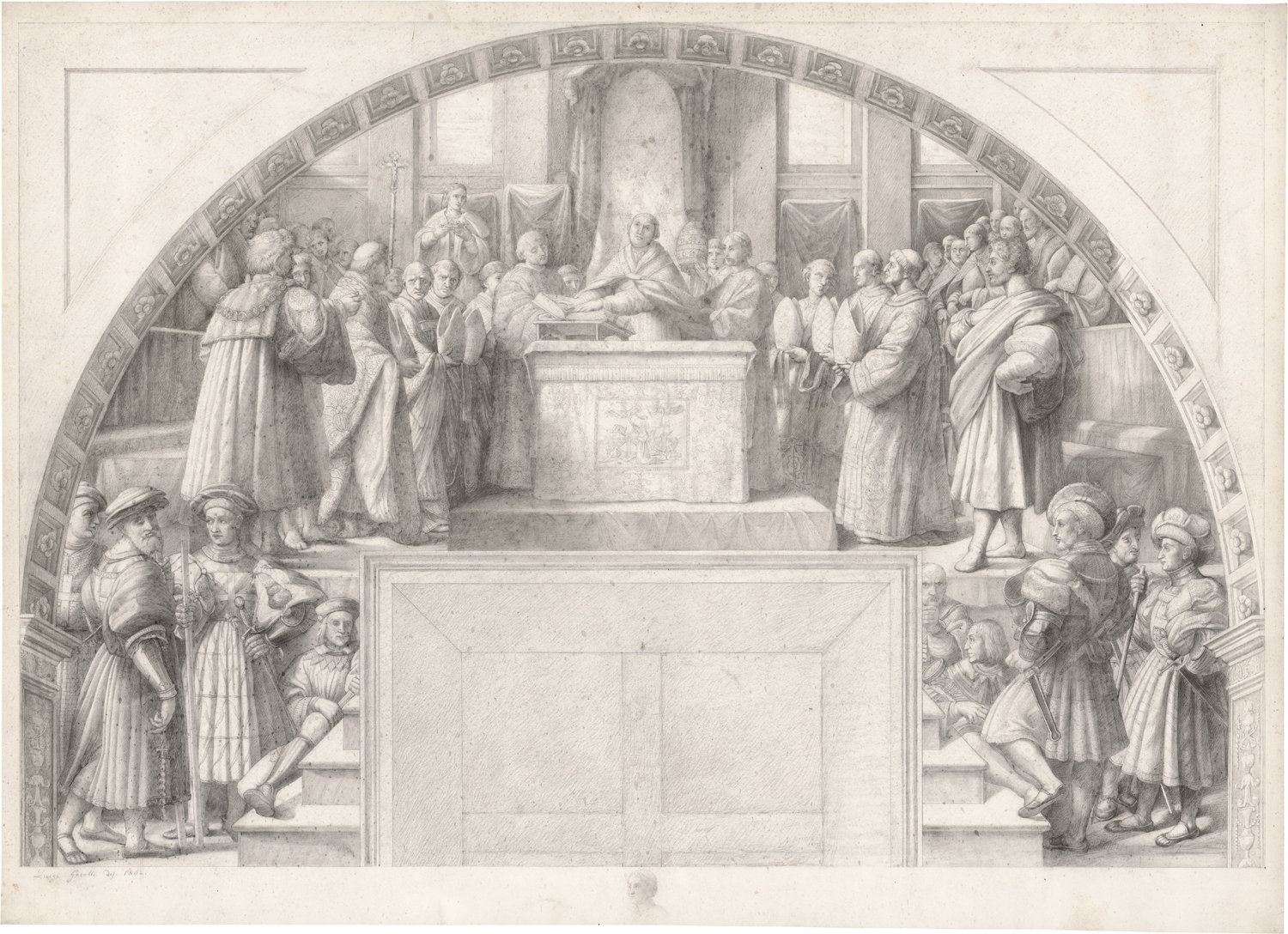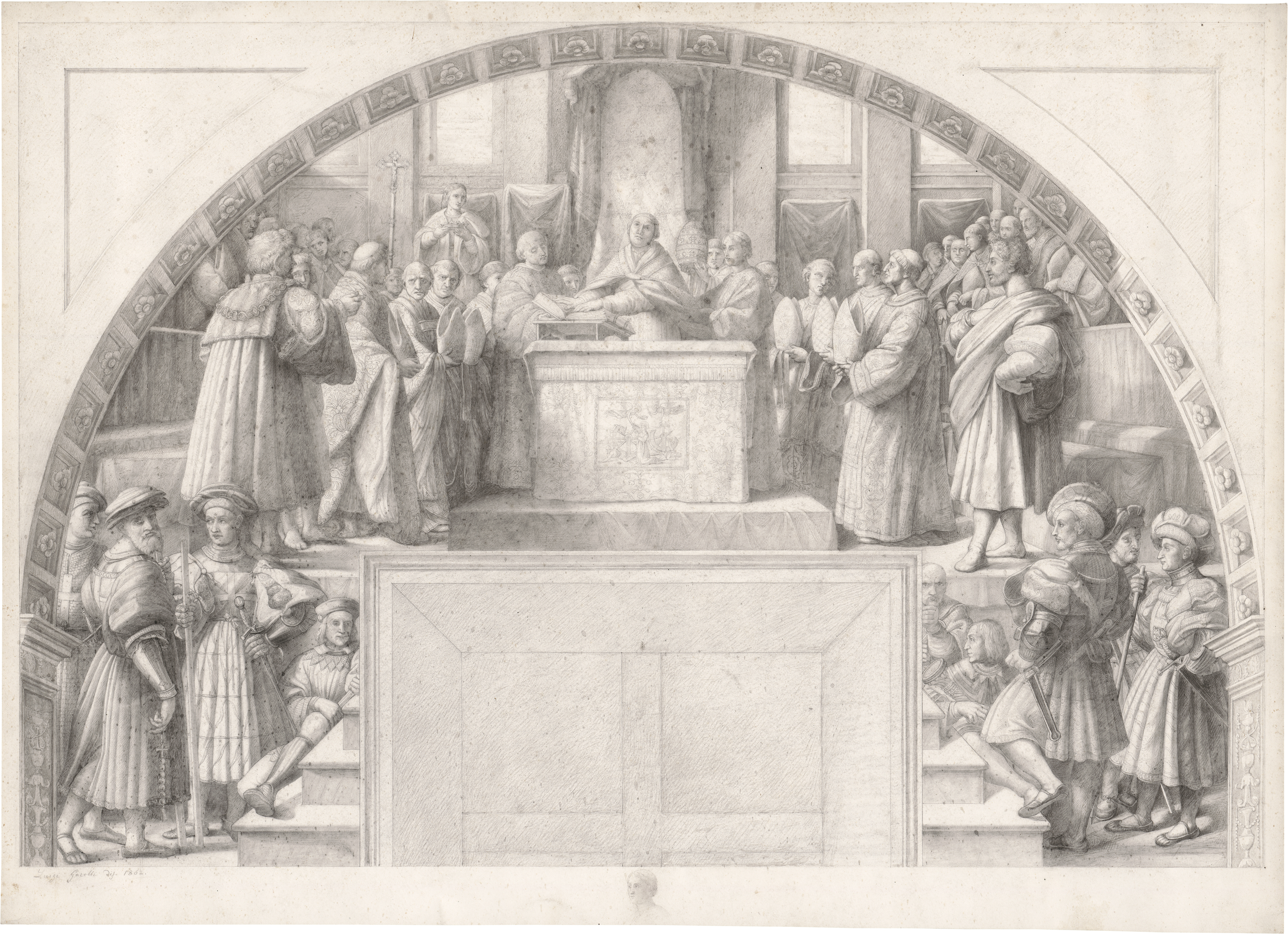 3 Zeichnungen, je Bleistift, Feder in Grau, grau laviert. 49,7 x 49,1 cm bis 52,2 x 69,2 cm. Der Reinigungseid Leos III. unten links signiert und datiert "Luigi Garelli dis. 1862".