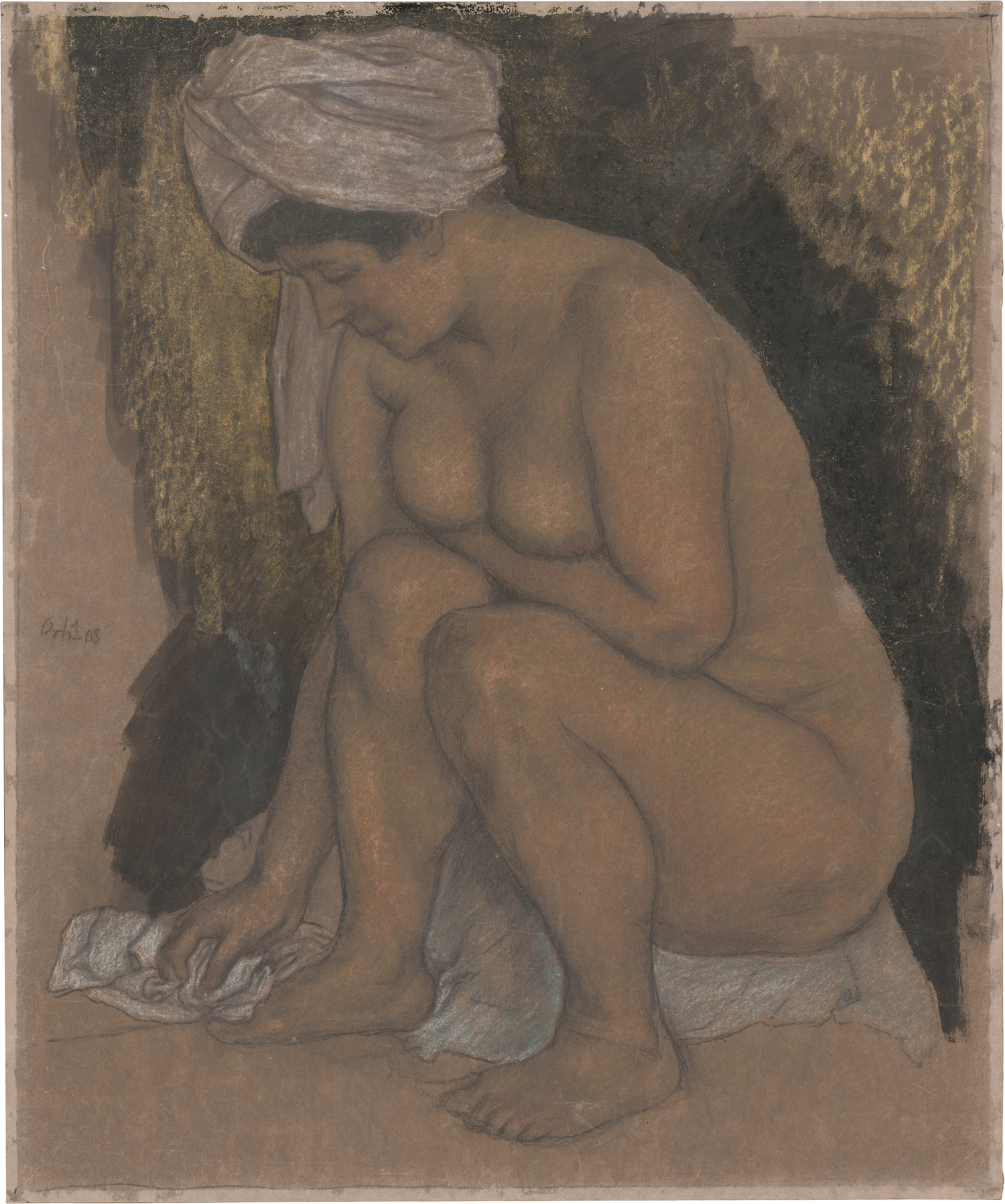 Nach dem Bade sitzt die junge Frau, sich die Füße abtrocknend, ein Handtuch zum Turban um den Kopf gebunden, vor unbestimmtem dunklem Hintergrund. Orlik zeichnet den sehr präsenten, zusammengekauerten Körper des Modells mit weichen Konturen und sanften Schattierungen in harmonischer Tonalität. Im Jahr 1908 wurde Orlik Mitglied der Berliner Sezession.