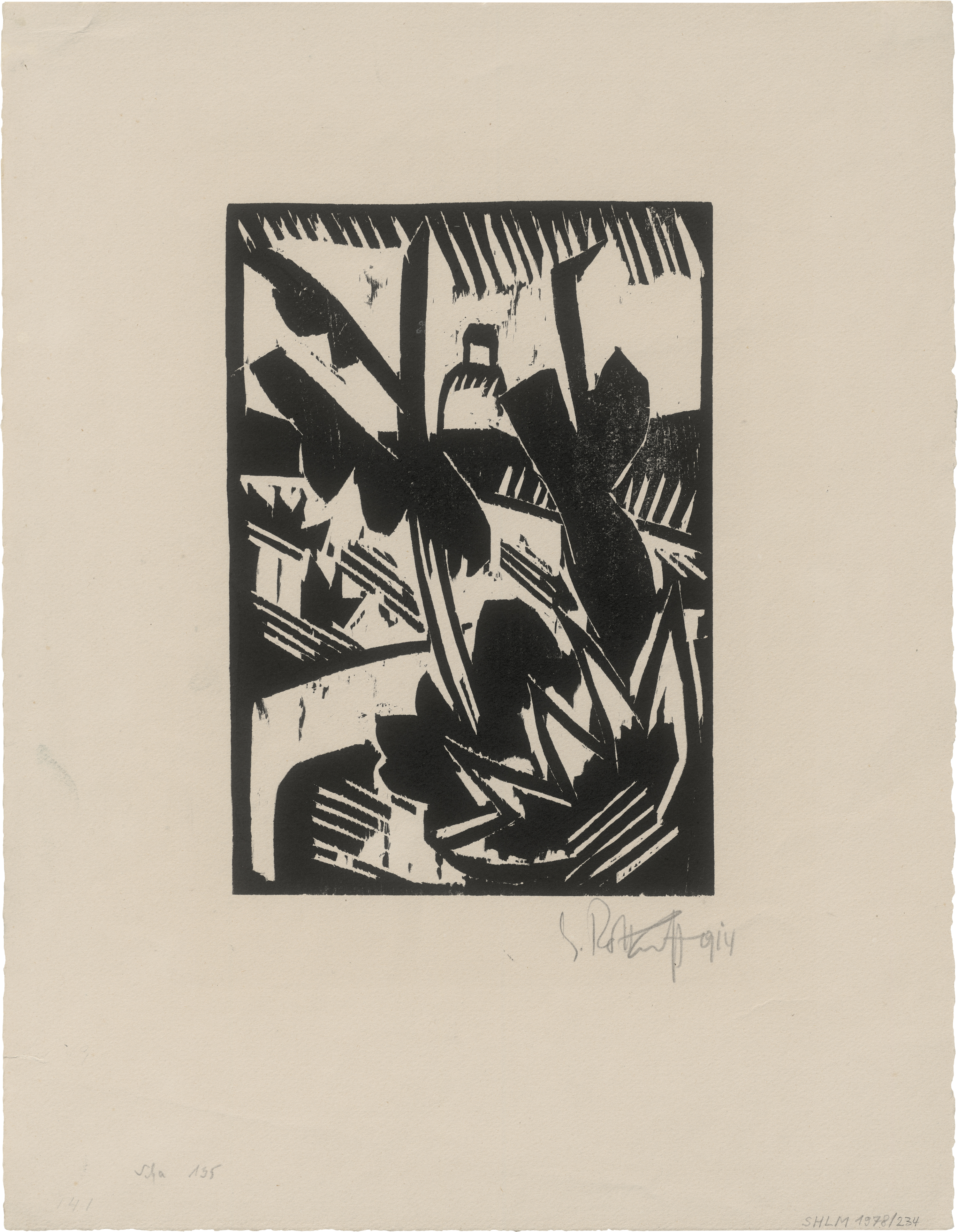 In keinem anderen Medium verwirklicht Schmidt-Rottluff seine expressionistischen Ideen so konsequent wie im Holzschnitt, und er gilt als der wohl ursprünglichste Künstler der Brücke-Gruppe. Die vorliegende "Kleine Landschaft mit Leuchtturm" zeigt bereits die etwas wuchtig-monumentale, stilisierte Formensprache, die er nach der Auflösung der Künstlergemeinschaft "Die Brücke" im Jahr 1913 entwickelte. Die Küstenlandschaft zeigt im Hintergrund den Leuchtturm aus Nidden, den Schmidt-Rottluff wiederholt gemalt und in Holz geschnitten hat. Hier ist es Schapire zufolge ein Stück des relativ weichen Fichtenholzes, dessen großzügige Maserung stellenweise ausdrucksvoll aus den Schwärzen hervortritt. Ganz prachtvoller, kräftiger und satter Druck mit dem wohl vollen Rand. Von größter Seltenheit.