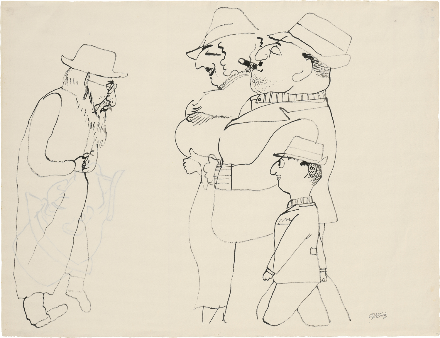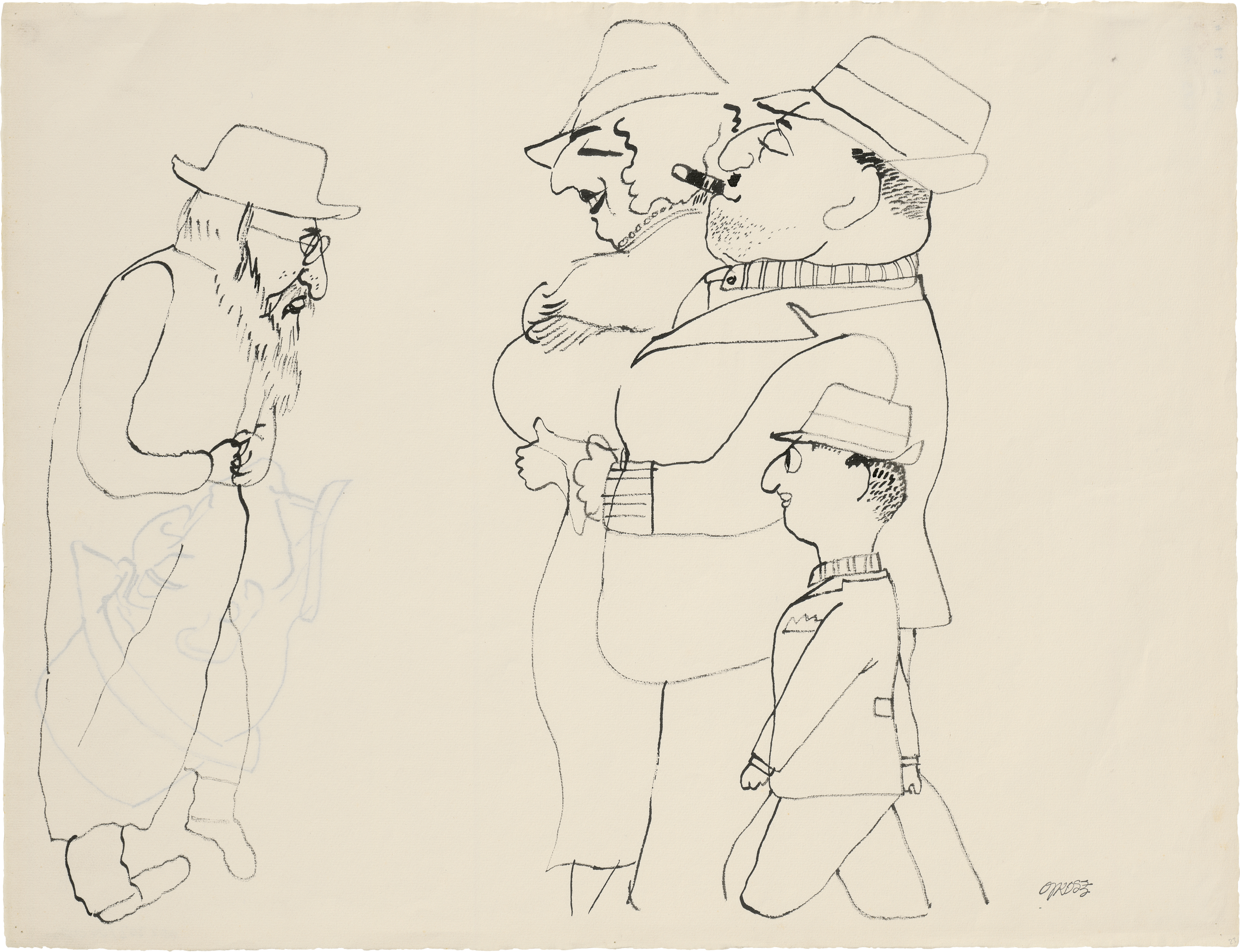 Eine zufällige Begegnung auf der Straße arrangiert Grosz so, dass in den zügig konturierten Figuren die Gegensätze von Arm und Reich aufeinandertreffen. Der genaue Titel dieser Zeichnung ist nicht bekannt, aber ohne Zweifel spielt die Szene in New York, wo Grosz sich 1932 anlässlich seines Lehrauftrags an der renommierten Art Students League zum ersten Mal aufgehalten hatte, ehe er 1933 endgültig dorthin übersiedelte. Grosz, von Anfang an von dieser Stadt begeistert, liebte New York und durchstreifte die City immer wieder, was seinen Niederschlag in unzähligen Skizzen, in großformatigen Zeichnungen und Aquarellen fand. Verso eine Federskizze des Künstlers, "Passant mit Hut". Die Zeichnung ist Ralph Jentsch, Berlin, bekannt. Die Arbeit wird in das in Vorbereitung befindliche Werkverzeichnis der Arbeiten auf Papier aufgenommen.