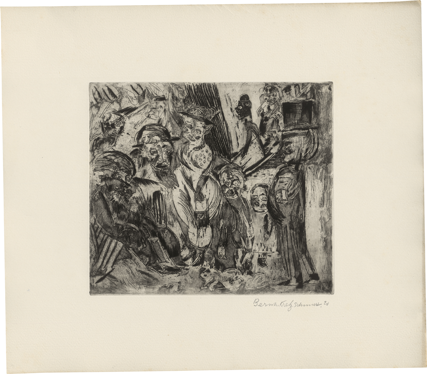 Expressionistisches Blatt von großer Erzählfreudigkeit: Gesellschaftskritisch und durchaus humorvoll schildert Kretzschmar die belebte Straßenszene. Entstanden ist die Kaltnadel 1920, in dem Jahr, in dem der Künstler nach Ausflügen zum Linol- und Holzschnitt wie auch zur Lithographie sich wieder der Radierung zuwandte, die in den folgenden Jahren im Mittelpunkt seines Schaffens stehen sollte. Brillanter, wunderbar gratiger Druck mit schön differenziertem Aquatintaton und dem vollen Rand.