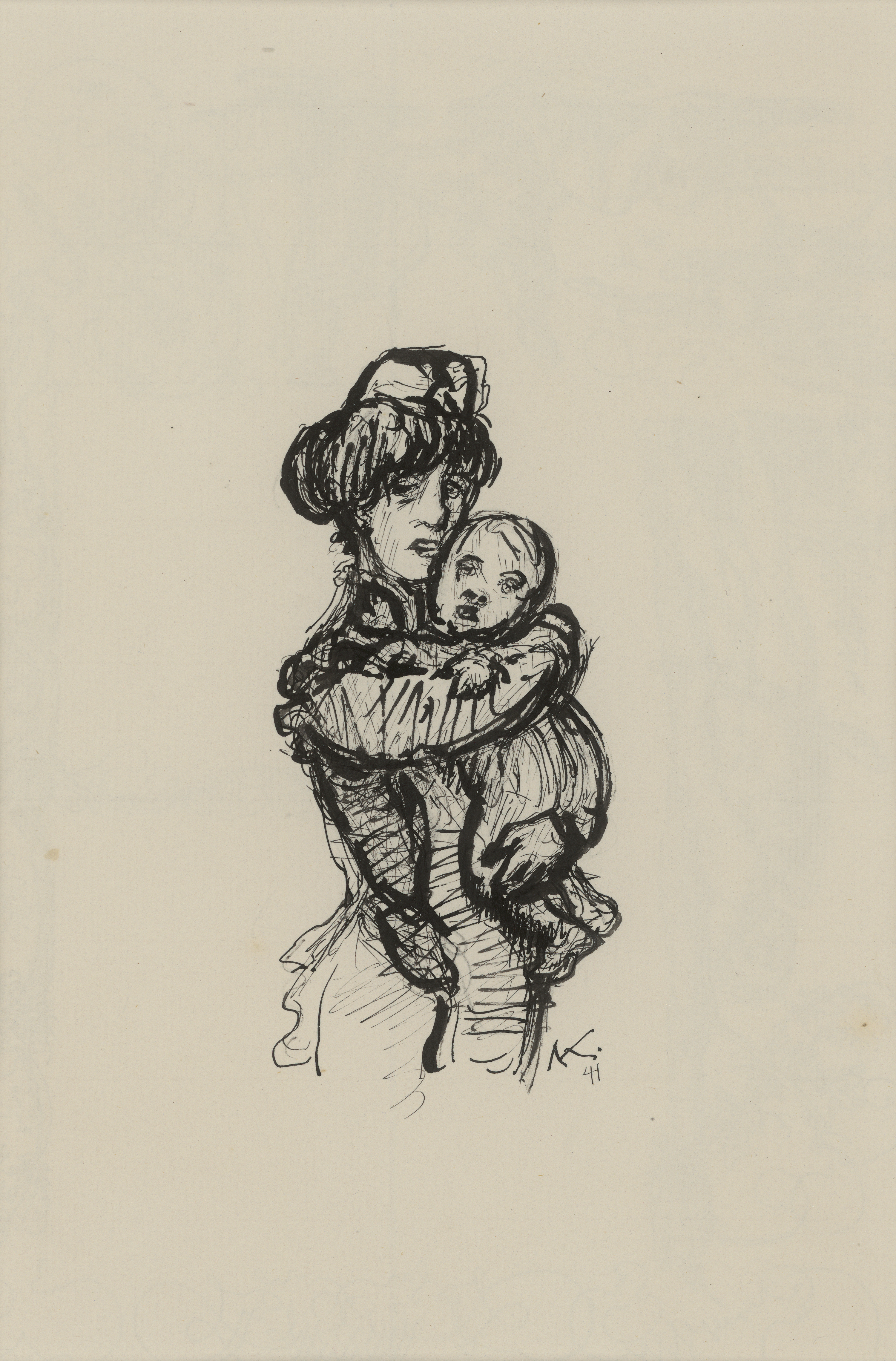 Innig und ganz eng hält die Pflegerin das Kleine an sich gedrückt, beide blicken gleichermaßen ernsthaft zum Betrachter. Ausdrucksvoll bringt Kubin die japanische Tusche mit feiner, dazu auch ganz breiter Feder aufs Papier und lässt daraus die Halbfigur der stehenden Kinderfrau mit einem Baby im Arm entstehen.