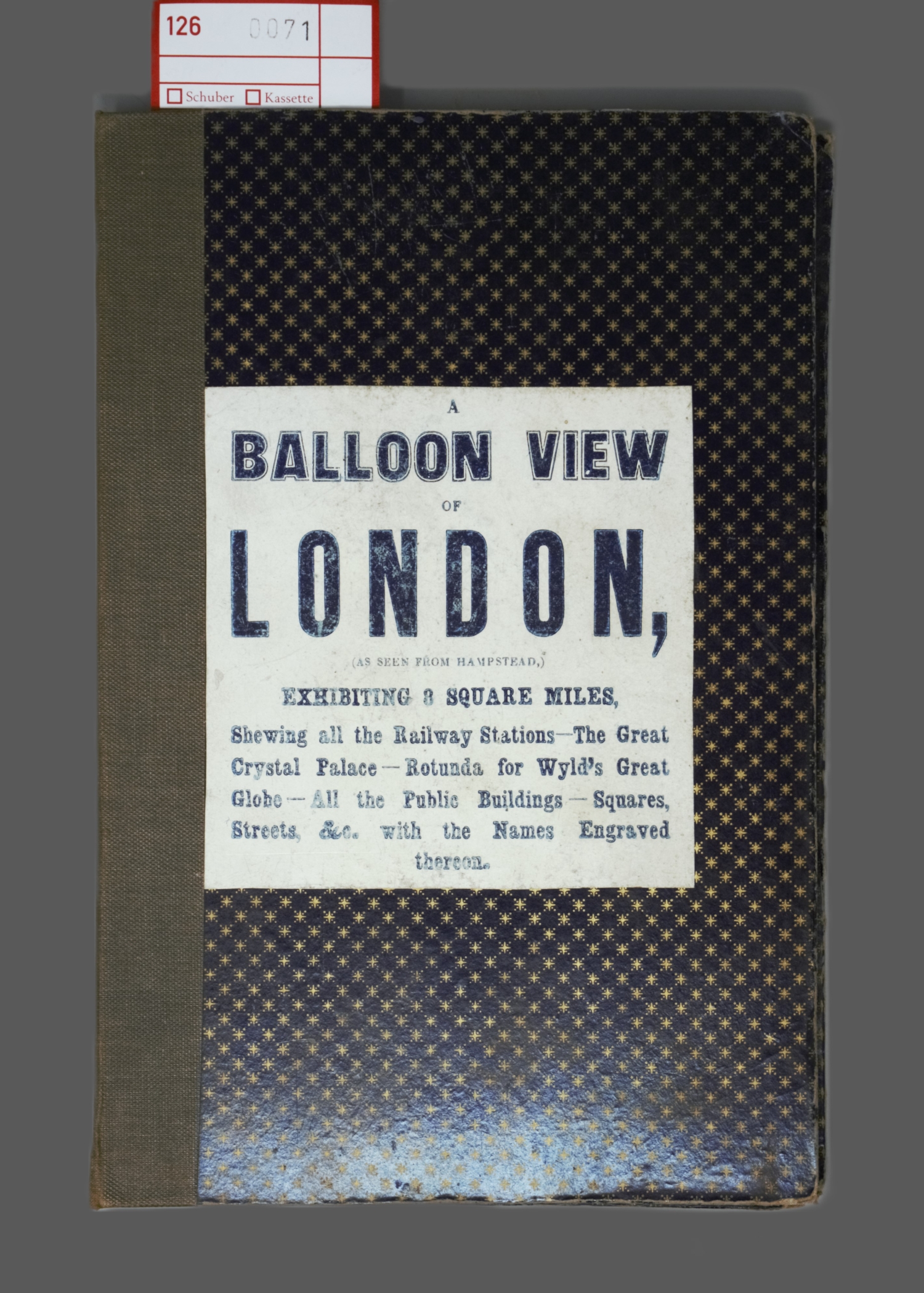 A Balloon View of London as seen from Hampstead. Lithographische Karte in 21 Segmenten auf Leinen gezogen. 63 x 105,5 cm. Späteres Halbleinen (restaurierter Rücken, Deckel berieben und bestoßen) mit montiertem DSchild im modernen Pappschuber. London, Banks & Co., um 1851.