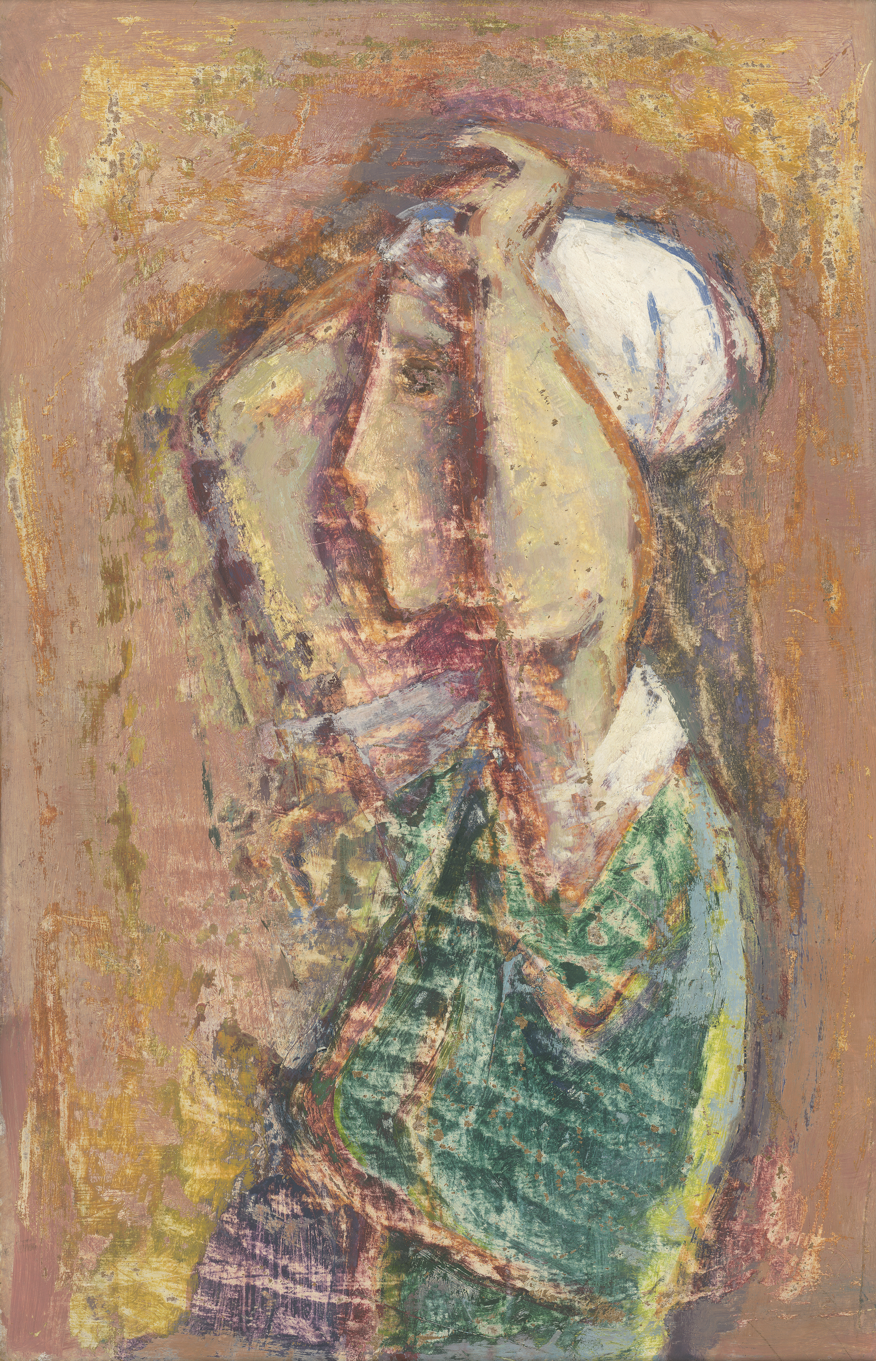 In einer hochspannenden, dynamisch-rhythmisch gestalteten Spachteltechnik schafft Hofer mit dem eigenartig entrückten Mädchenbildnis ein eindringliches Werk. Die Beseeltheit des Menschen ist der entscheidende Ausdruck, den Hofer in seinen Bildnissen einzufangen versucht. Seine Figuren sind nicht in erster Linie Individuen; über seine Modelle gibt der Künstler kaum verbindliche Auskunft. Auch im vorliegenden Werk gelingt es Hofer, Distanz zu schaffen: Er dreht das Mädchen ins Profil und verdeckt dazu noch die Hälfte der Gesichtspartie mit dem erhobenen Arm. Zugleich umrahmen beide Arme das Antlitz des Modells und betonen das zarte Profil im Zentrum des Bildes. Summarisch behandelt Hofer die Figur, aus den abstrahierten Formen und rhythmisch unterbrochenen Farbflächen artikuliert sich ein überzeugend plastisch-räumlich erscheinendes Bildnis. Unser Gemälde besticht mit dem feinsinnig abgestimmten, in delikaten Kontrasten gestalteten Kolorit von Antlitz, Kleidung und Hintergrund. 1931 schrieb der Dichter Alfred Mombert in einem Brief an Hans Reinhart: "Er ist selbstverständlich kein 'Portrait'-Maler. Es kommt ihm ja nicht darauf an, ein Stück Welt (in diesem Falle einen bestimmten homo) festzulegen, sondern Alles ist ihm Ausdrucksmittel zur Erkenntnis seiner Psyche." (zit. nach: Jürgen Schilling, Karl Hofer, Unna 1991, S. 23).