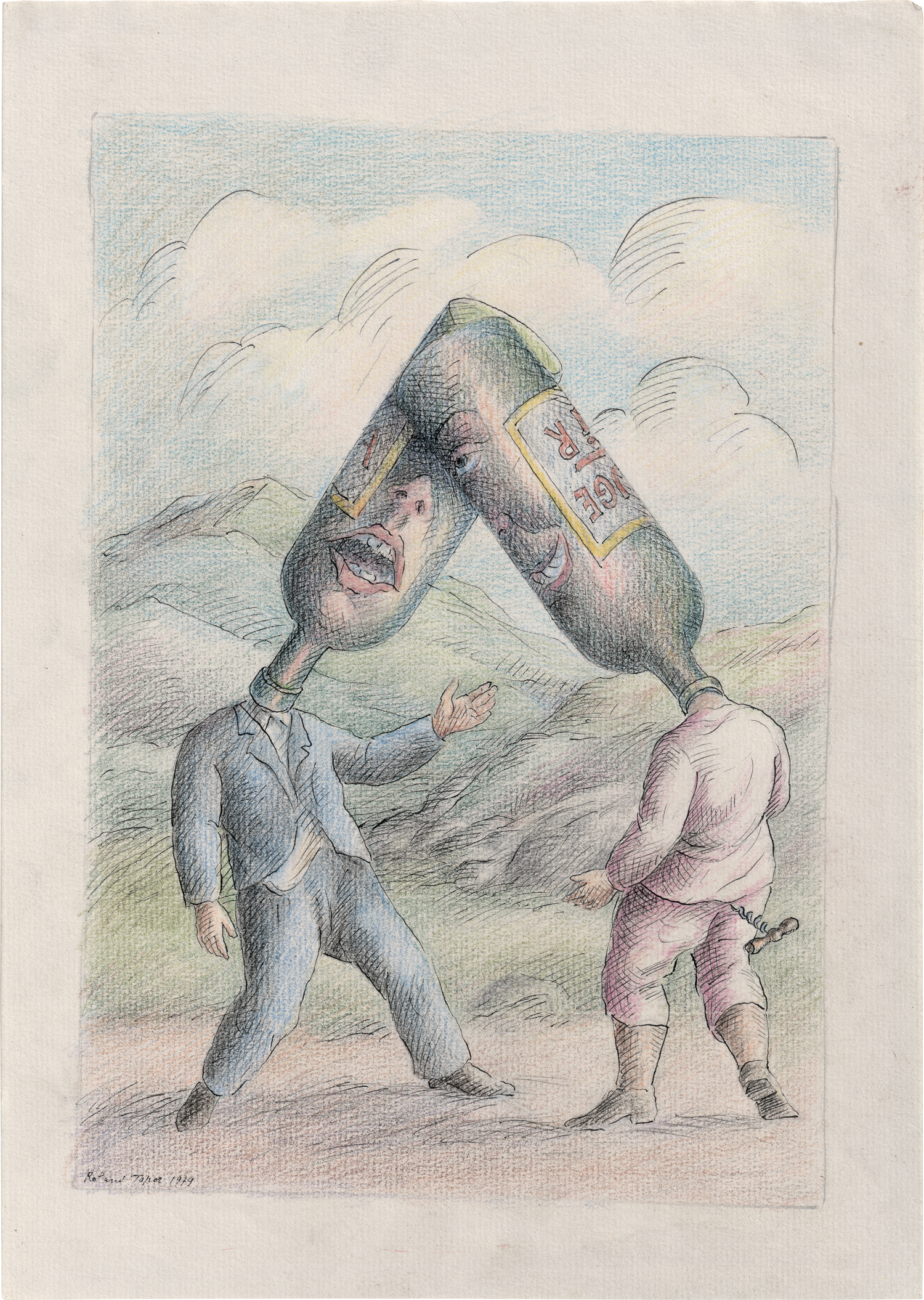 Unten links mit Feder in Schwarz signiert "Roland Topor" und datiert, verso mit Bleistift (schwer lesbar) betitelt.