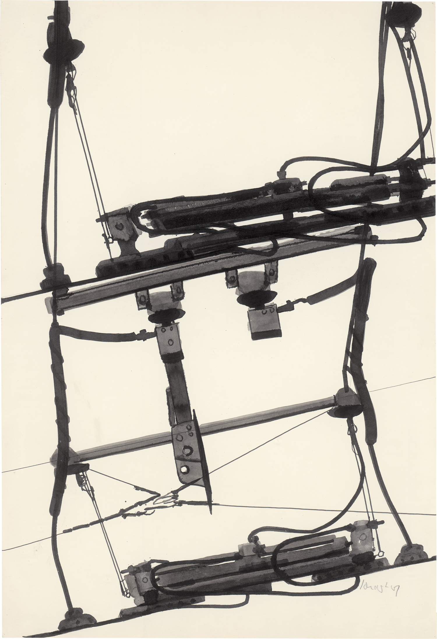 Charakteristische, betont reduzierte, zugleich expressiv ausgeführte Komposition Sonderborgs, der als einer der bedeutendsten Vertreter des Informel gilt. Anklänge an mechanische Konstruktionen, insbesondere an die Stromabnehmer von Straßenbahnen, verleihen der Zeichnung einen kraftvollen, ausdrucksstarken Charakter. Der Duktus mit den geraden, schräg eingesetzten Linien verleiht der monochromen Komposition einen ganz eigenen Reiz. Nur ungern sah Sonderborg seine Arbeit in kunsthistorische Kategorien eingeordnet.