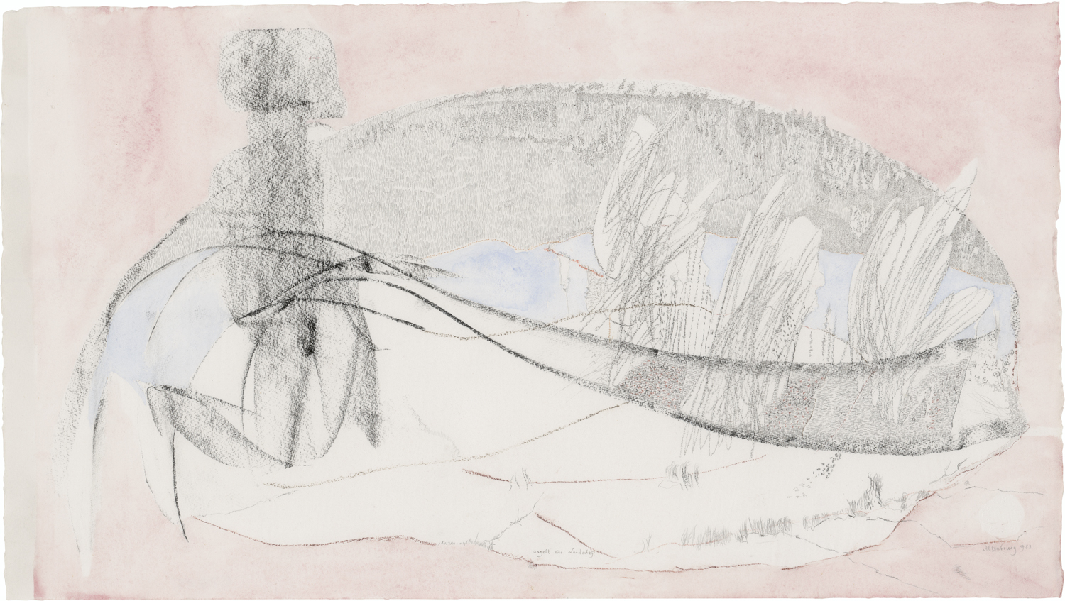 Eine vielfältige Mischung an Farben: Pitt-Kreiden, Bleistift, Pastell, Rötel, Aquarell, Gouache, Pulverfarbe, Chinesische Tusche und Staub kombiniert Altenbourg in der zart schwingenden Komposition, die in hinreißender Weise Figur und Landschaft verknüpft. Tausende von Strichlein, Häkchen, Kringeln und Pünktchen fügen sich zu der poetischen, detailreich-skurrilen Darstellung, welche die unregelmäßige Oberfläche des handgeschöpften Papiers wunderbar mit einbezieht.