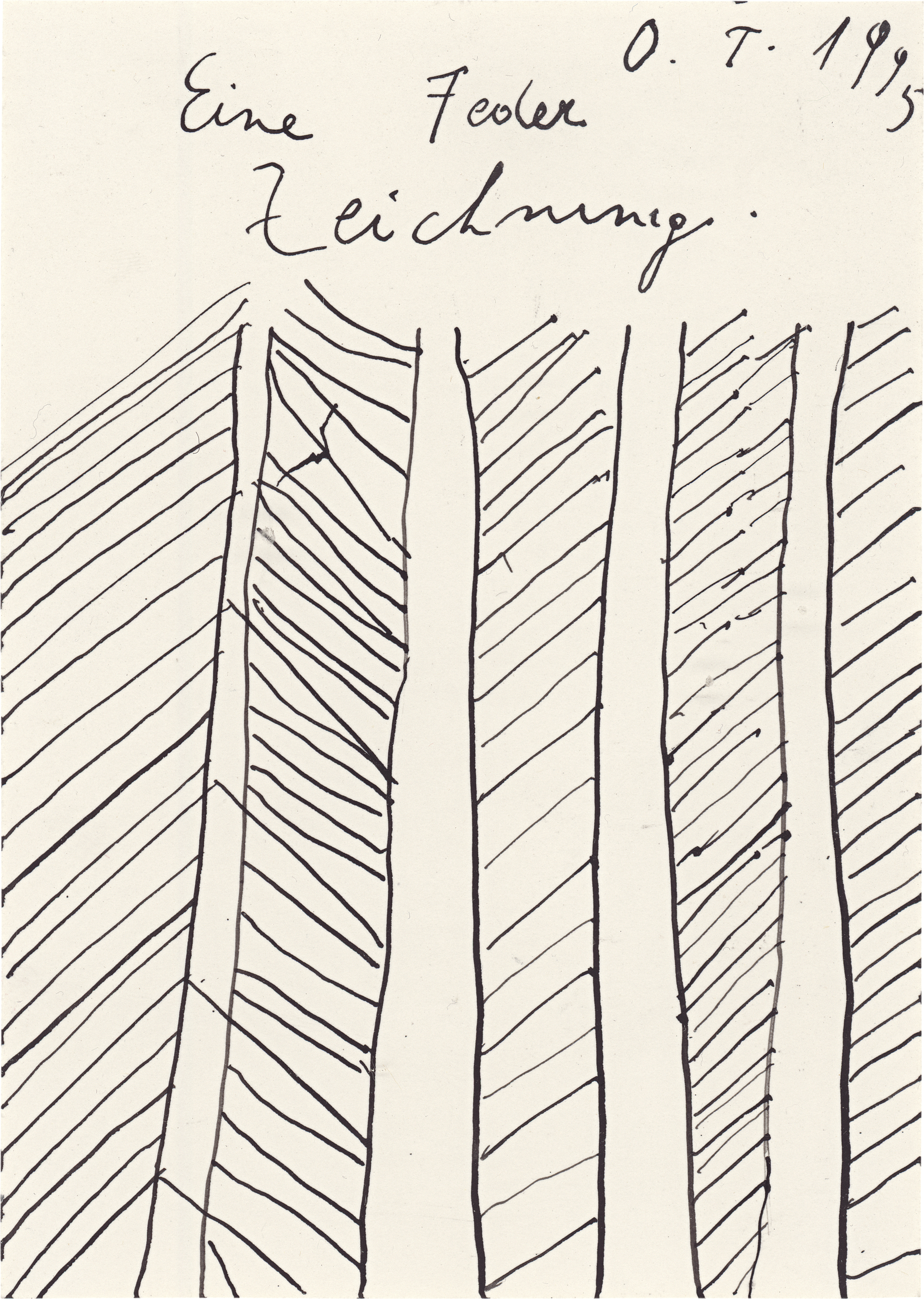 Das Thema ist wie immer oben auf dem Blatt notiert, und Tschirtner füllt das Format dementsprechend mit Federstrukturen. Von schweren Kriegserlebnissen traumatisiert, lebte er seit 1947 in der psychiatrischen Anstalt Gugging. Von dem Psychater Leo Navratil zu einer künstlerischen Tätigkeit ermutigt, entwickelte er eine zugespitzt minimalistische Zeichenweise, aus der er, meist im kleinen Format, verdichtete und ebenso eigenwillige wie reizvolle Skizzenbilder entwickelte. Er gilt heute als wichtiger Vertreter der Art Brut.