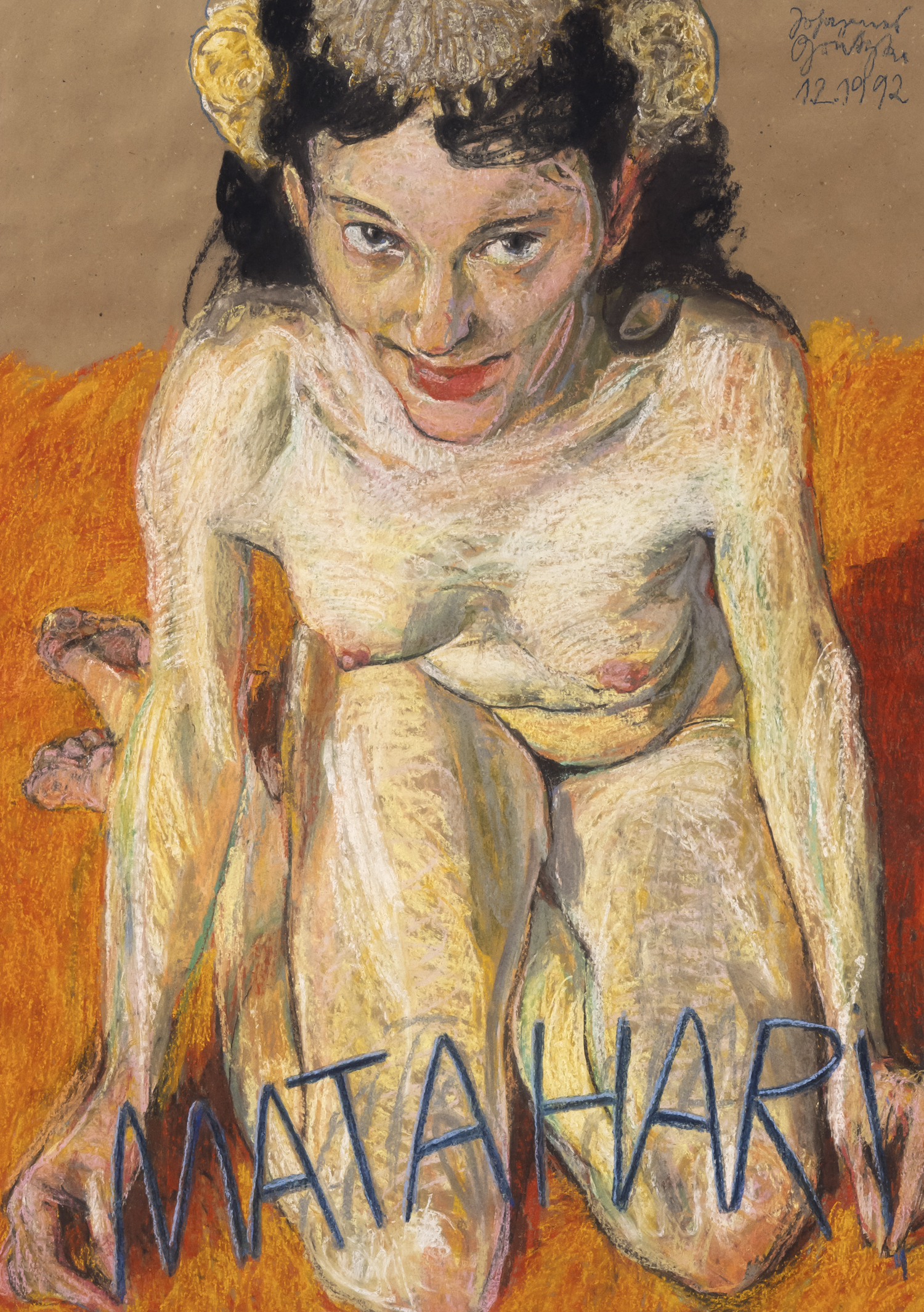 Mit lockendem Lächeln und ungezwungener Nacktheit blickt die am Boden kniende Tänzerin und Doppelspionin zum Betrachter empor in Grützkes großformatigem Entwurf für das Plakat zu den Tanzaufführungen von Verena Weiss als Mata Hari im Deutschen Schauspielhaus Hamburg. Das Braun des von Grützke mit Vorliebe für seine monumentalen Pastelle verwendeten Packpapiers bildet über dem intensiv leuchtenden Orange des Bodens den Hintergrund für die kniende Figur und schimmert hier und da durch den hellen Glanz des mit lockeren Linien gestalteten Inkarnats hindurch. Spielerisch ersetzt der Künstler das "I" am Schluss des Titels durch einen Bleistift in den Händen Mata Haris, und auch das "M" greift die berühmte Nackttänzerin, als wäre es ein fragiler Gegenstand.