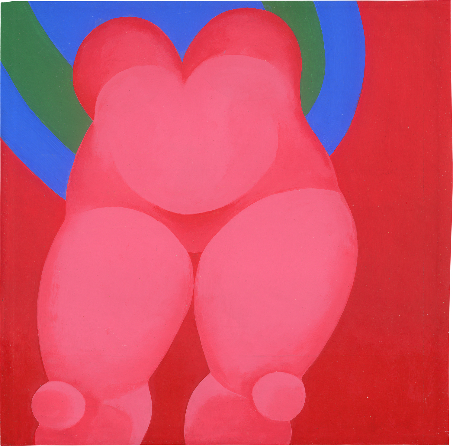 Ludi Armbruster wirkte als eine der wenigen weiblichen deutschen Pop-Art-Künstlerinnen in München. In ihren farbintensiven, meist quadratischen Arbeiten thematisiert sie den weiblichen Körper. Knallig plakativ und im Ausschnitt stark vereinfacht, platziert Armbruster die runden Formen vom Bauch abwärts bis kurz über die Kniescheiben derart in das Quadrat, dass eine abstrakte Komposition in leuchtenden Rot- und Rosatönen entsteht, denen sie den starken Kontrast von Dunkelblau und Dunkelgrün gegenüberstellt. Beigegeben: Ein Siebdruck der Künstlerin.