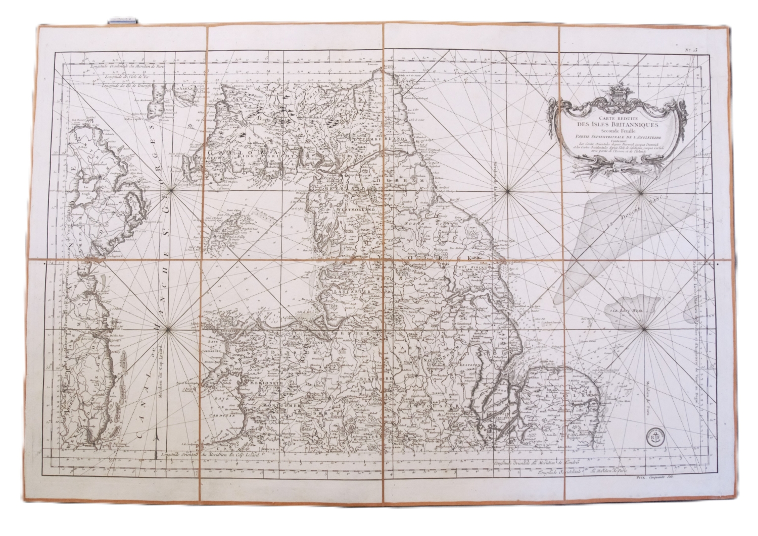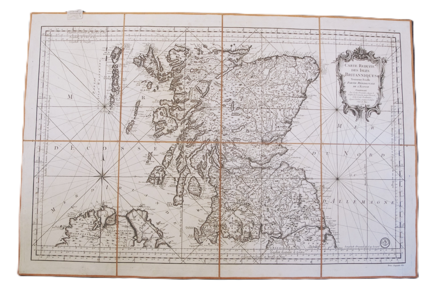 Die vier Seefahrer Karten stammen von dem Kartographen Jacques Nicolas Bellin (1703-1772), der unter anderem an an der "Encyclopédie" von Denis Diderot (1713-1784) und Jean Baptiste le Rond d’Alembert (1717-1783) mitwirkte. Vorhanden sind: I. Carte réduite des Isles Britannique en cinq feuilles. - II. Carte réduite des Isles Britannique en seconde feuilles. - III. Carte réduite des Isles Britannique en troisième feuilles. - IV. Carte réduite des Isles Britannique en quatrième feuilles. – Dabei: Derselbe. Carte réduite des Isles Britanniques cinquième feuille contenant l'Irlande. Kupferstichkarte. 90 x 57,5 cm (Plattenrand). Um 1801. - Mit kleinen Fehlstellen an den Falzen.
