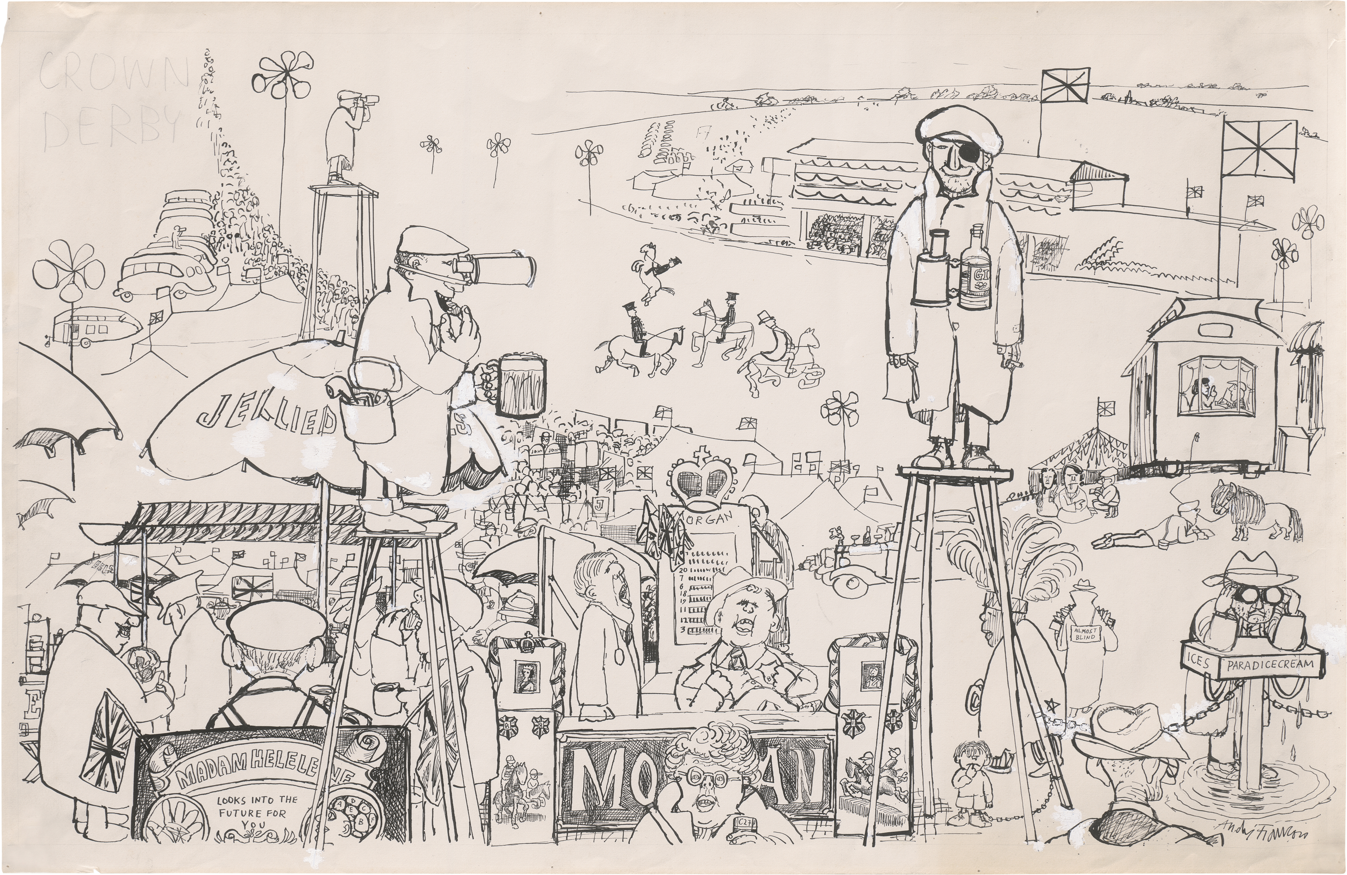 Skurriles Wimmelbild rund um das Motiv der Derby Stakes auf der Rennbahn „Epsom Downs“, die zweite Etappe für die britische Triple Crown.