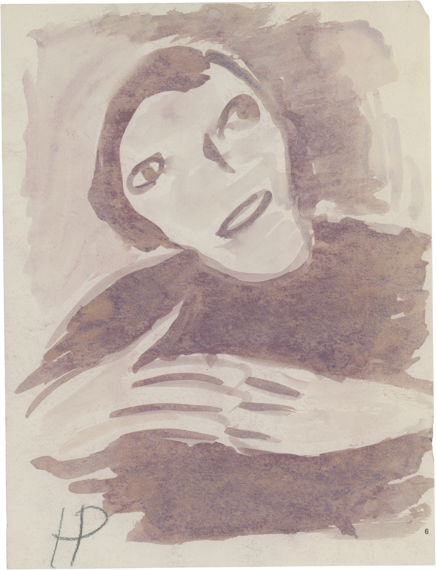 Das monochrome Violettbraun ist typisch für die sparsamen Kopf- und Figurennotizen Holmeads. Verso signierte Annotation des Vorbesitzers Stéphane Rey, Kunstkritiker der Brüsseler "Times": "Holmead - recu de l'artiste lors d'une visite à l'atelier le 4.4.72".