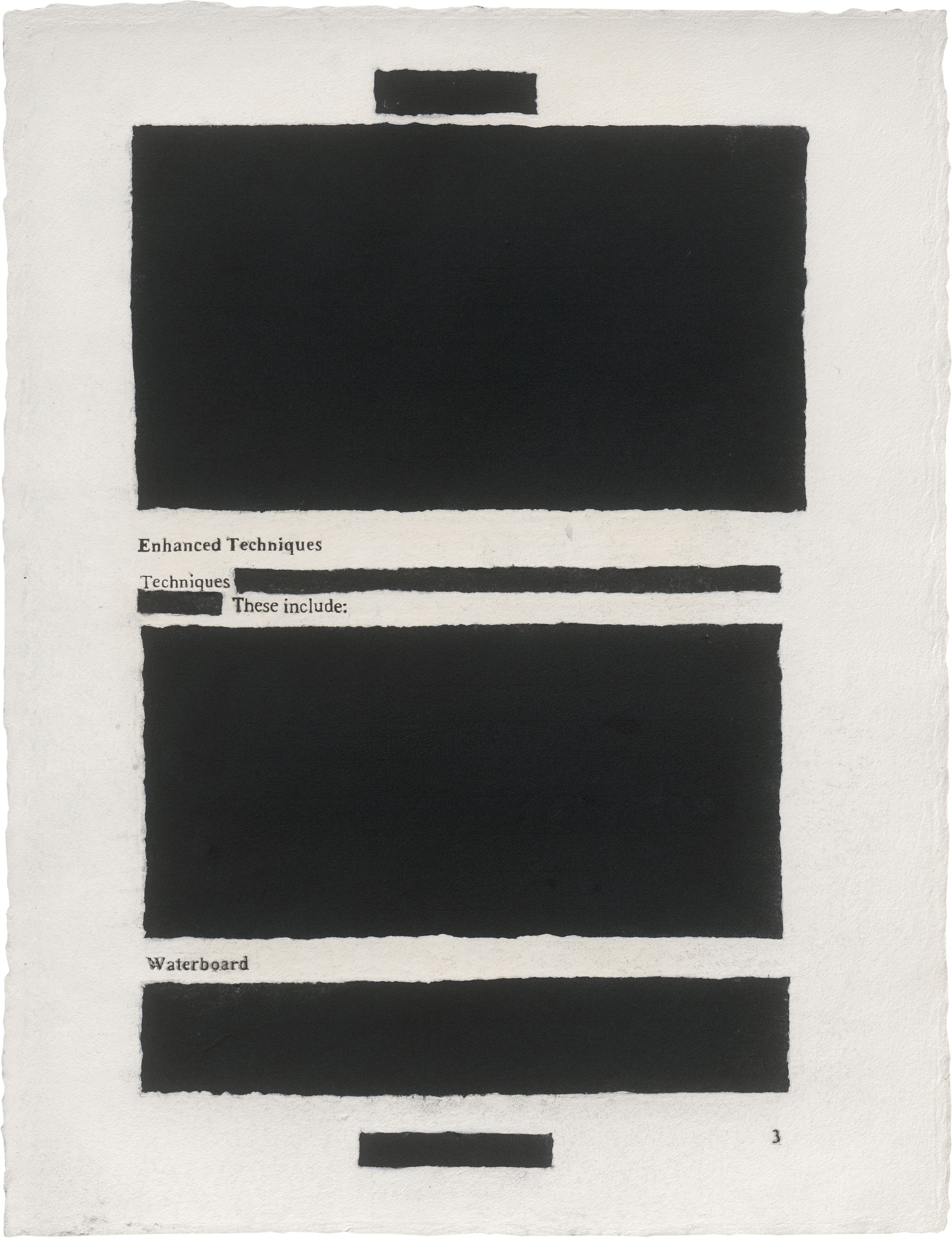 Jenny Holzer verwendet für die Edition vergrößerte Originaldokumente der CIA, die Textblöcke geschwärzt, und belässt nur die "Top Secret" Kennung der Dokumente lesbar. In einer technisch extrem aufwendigen Methode wird das Motiv von der Künstlerin einzeln von Hand geschöpft. Die geschwärzten Druckflächen in den Vorlagen sowie gedruckte Wörter und Zahlen werden durch schwarzen Faserstoff bzw. Papier erzeugt, nicht gedruckt, die Herstellung von Schwarzweiß-Kontrasten, das Grundprinzip unserer Schrift- und Druck-Tradition wird aufgehoben und somit hinterfragt. Es handelt sich somit um ein Unikat. Hergestellt von Gangolf Ulbricht, Berlin.