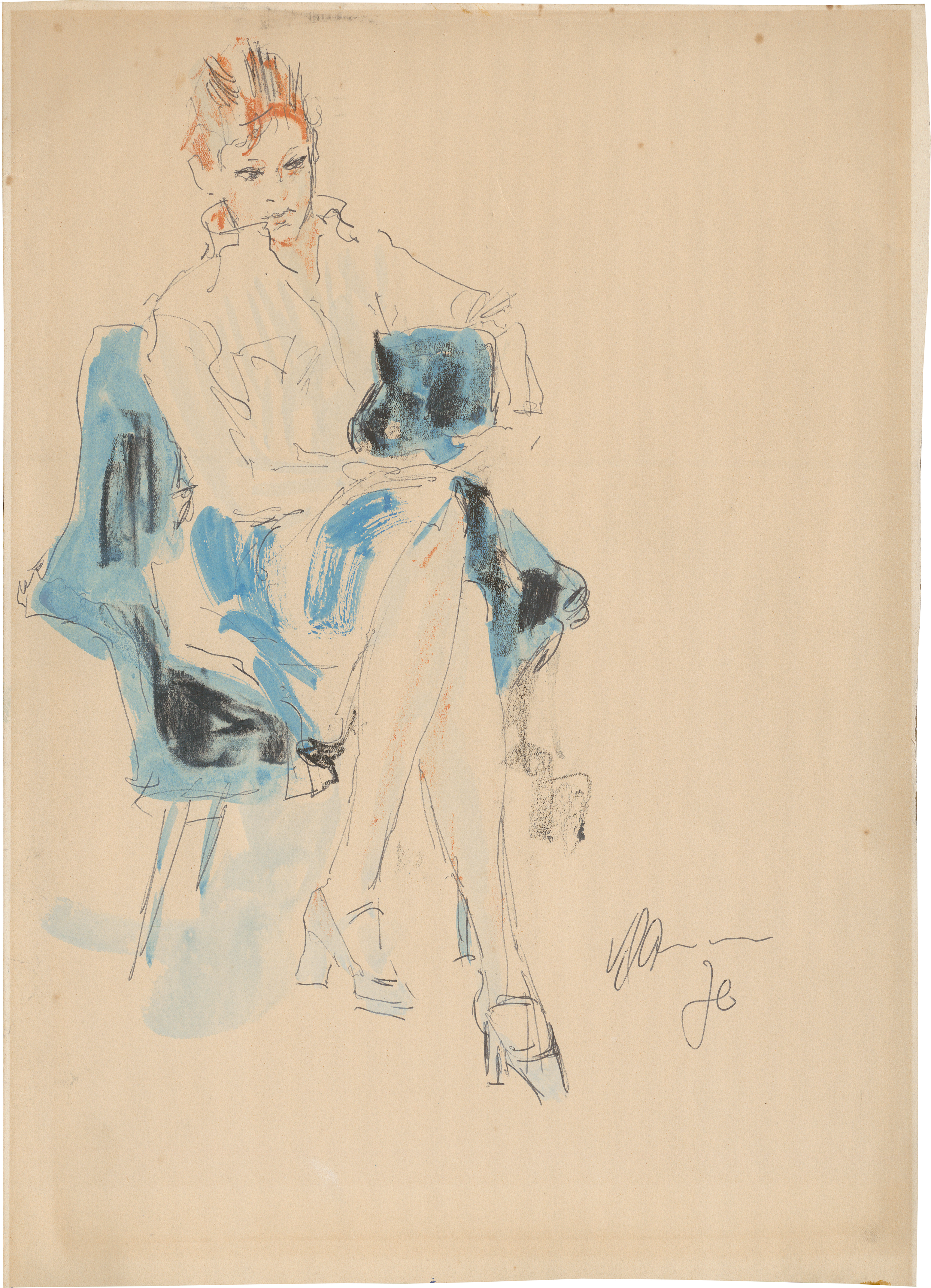 Allein mit dem Zweiklang von Rot und Blau, dazu wenigen Akzenten in Schwarz, erschafft der Künstler ein stimmiges Bildnis der sitzenden Frau im blauen Sessel. Verso Fragment einer weiteren Skizze Klamanns, Kopfstudie.