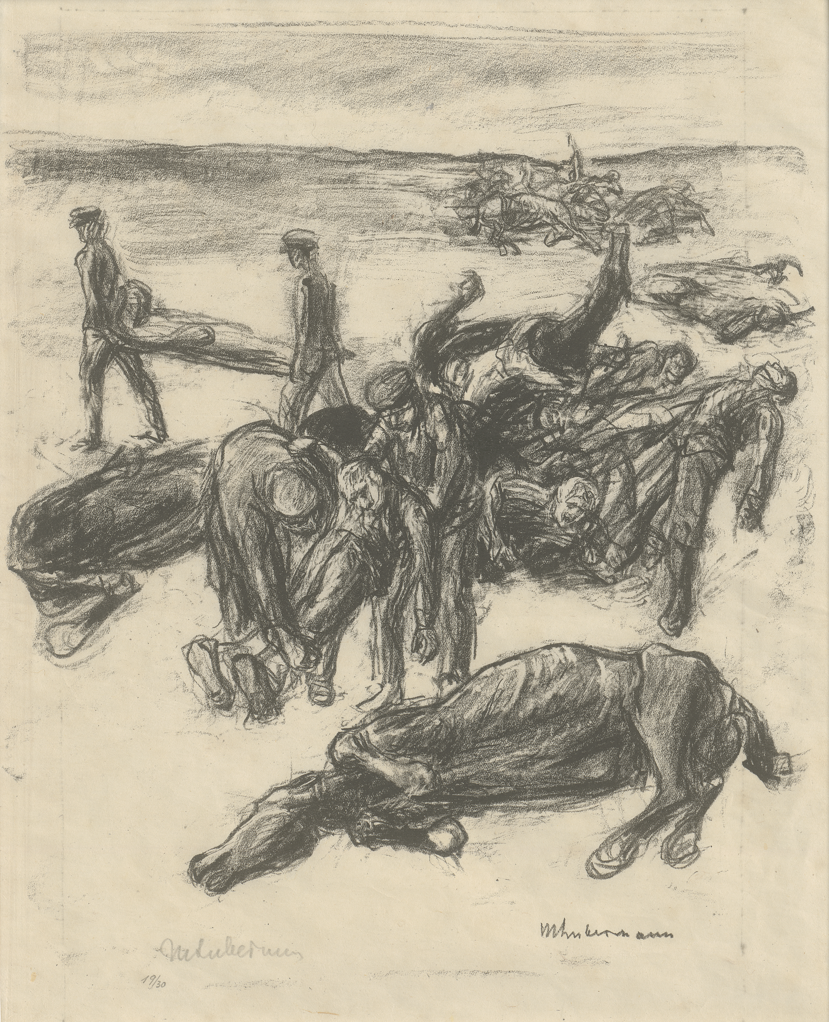 Die Lithographie entstand für die Zeitschrift "Kriegszeit", Heft 10, herausgegeben von Paul Cassirer, Berlin 1915. Ganz prachtvoller, kreidiger und tiefdunkler Druck mit dem wohl vollen Rand, rechts mit dem Schöpfrand. In dieser Form äußerst selten.