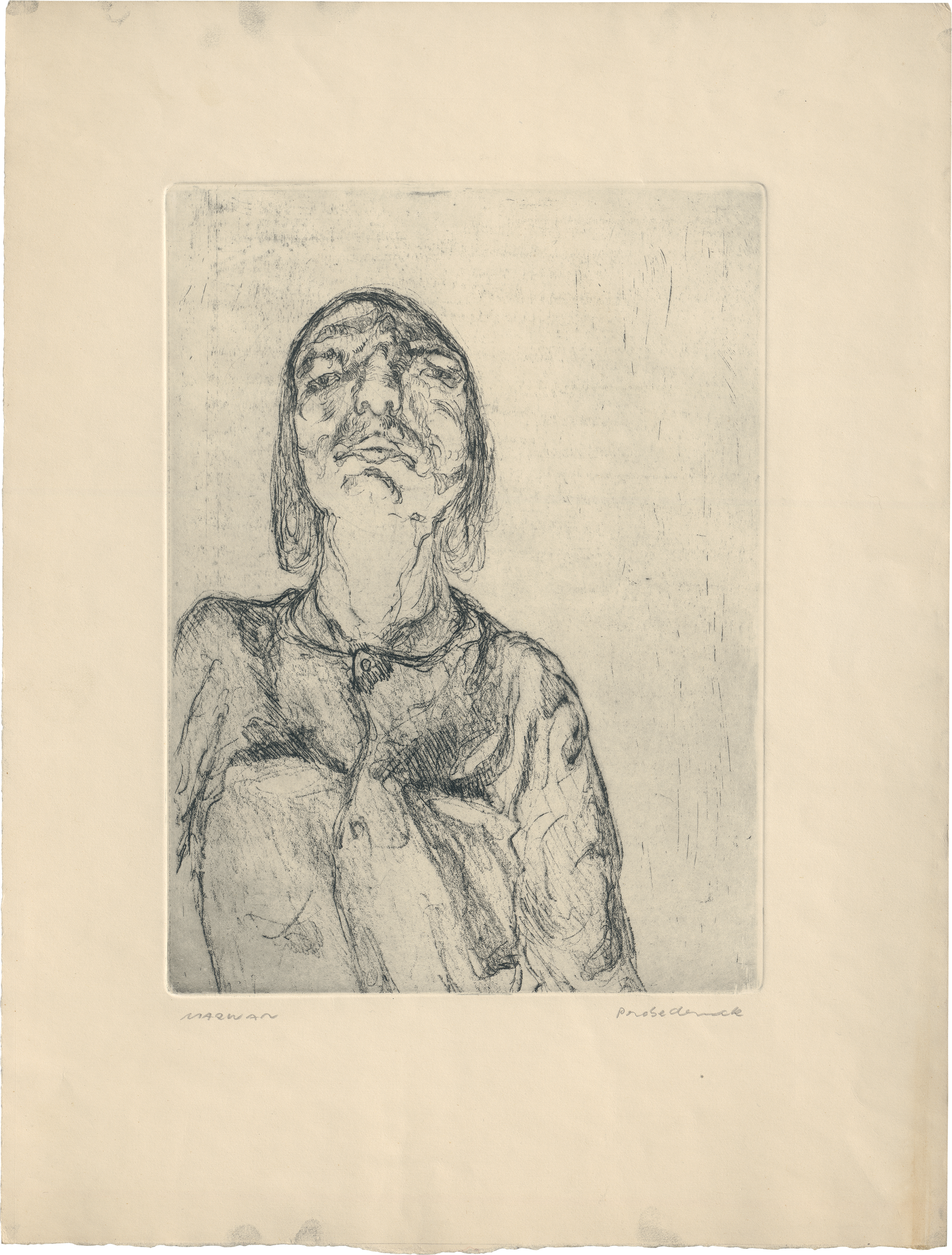 Das letzte Blatt der Mappe "Der Unverdeckte", hier in einem Probedruck außerhalb der Auflage von 50 Exemplaren. Prachtvoller Druck mit nuanciertem Plattenton, tief eingeprägter Plattenkante und charmanten Atelierspuren im breiten Rand.
